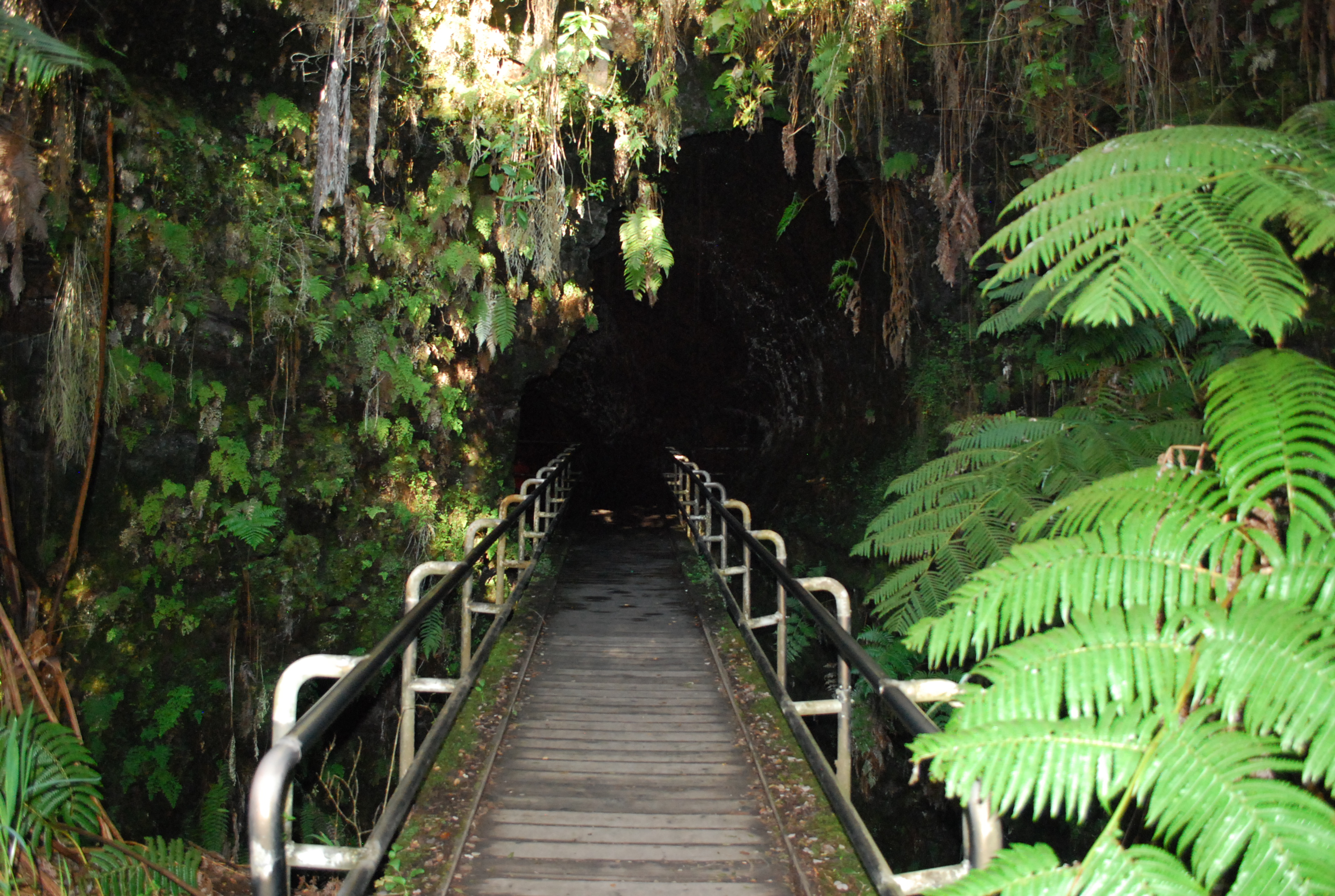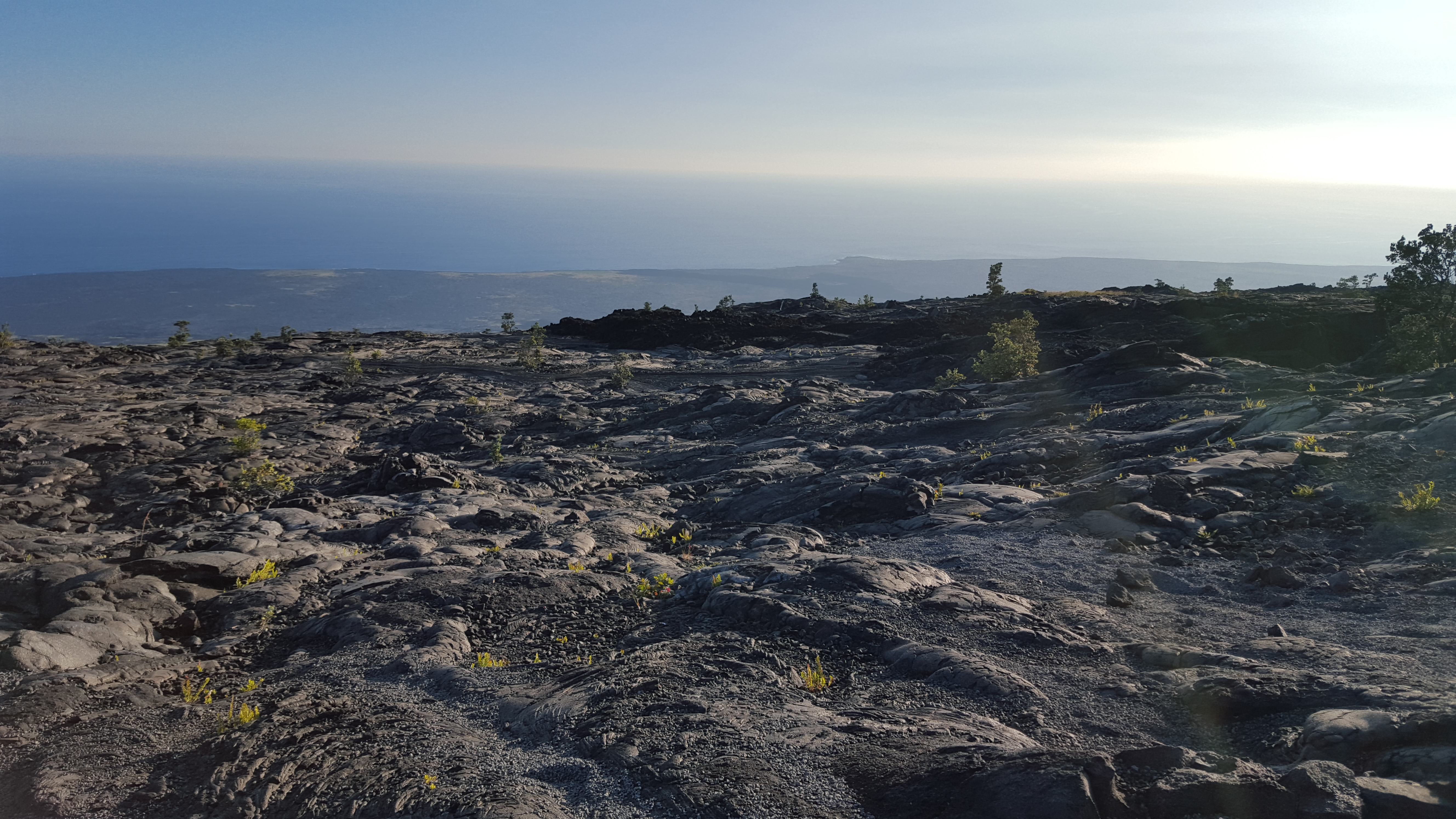 We drove the 19 mile ‘Chain of Craters Road’ which was incredibly scenic, starting with rainforest at the beginning (higher up the volcano), driving past several craters and to the barren volcanic landscape as we descended towards the sea. We visited the 500 year old Thurston lava tube (above) which is set within the rainforest. We followed the walkway which descended to the entrance, where the cool air was a welcome relief from the heat of the day. The lava tube has several lights which help guide you through the darkness. The tube could be described as a long black cave tunnel where water frequently drips from the roots of the trees above.