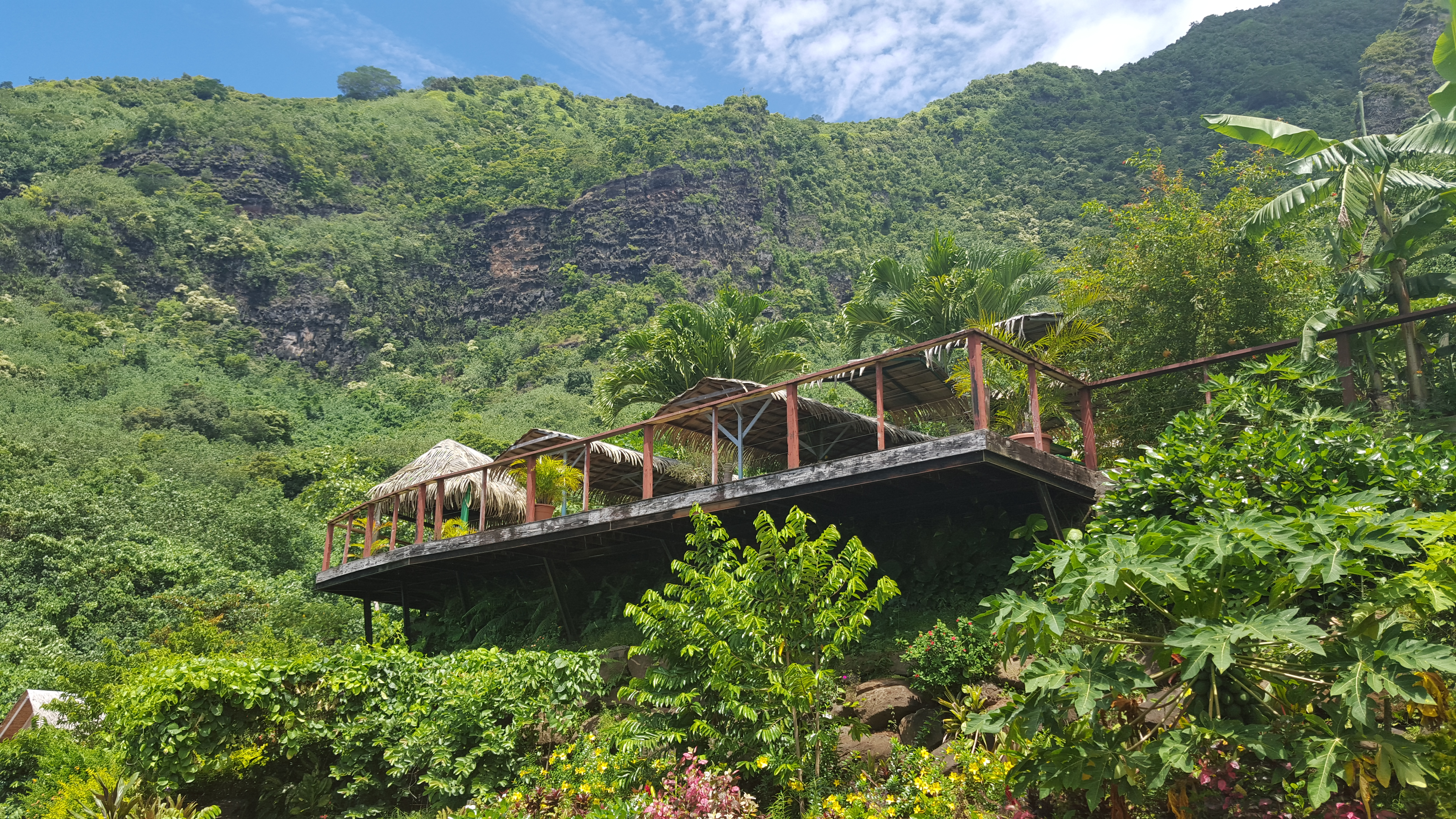 We stayed in another AirBnB in Moorea, this time in a tiny log cabin in the garden of our hosts. It had a futon bed upstairs on a small mezzanine floor, a bathroom, fridge and basic cooking facilities. The lovely owners Julia and Teme had stocked the fridge with a large carton of pineapple juice, a couple of beers and cold water. They also supplied coffee, tea, shampoo, shower gel and washing up liquid.