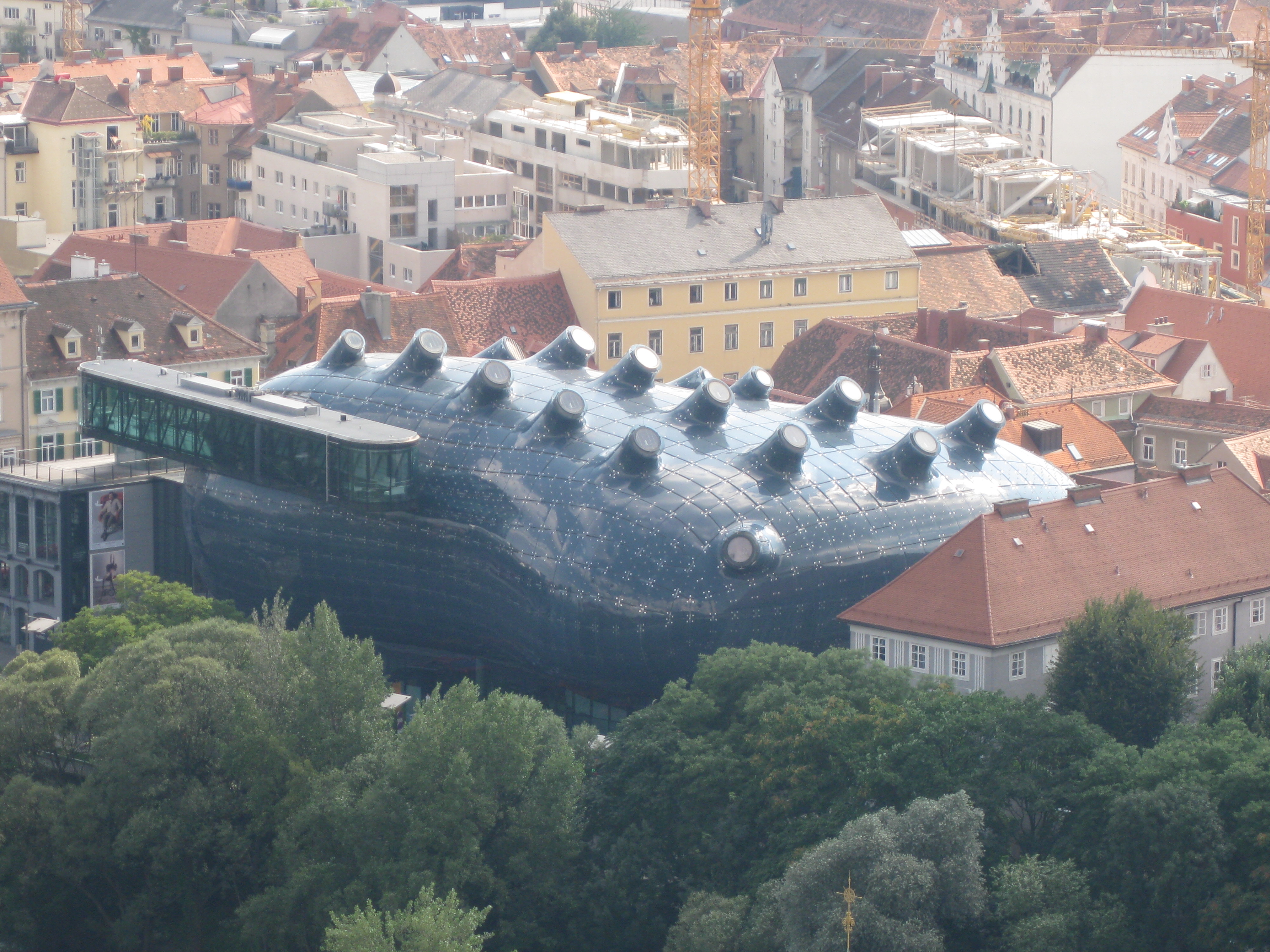 Above is the Kunsthaus, a shimmering blue contemporary building with an art centre inside.