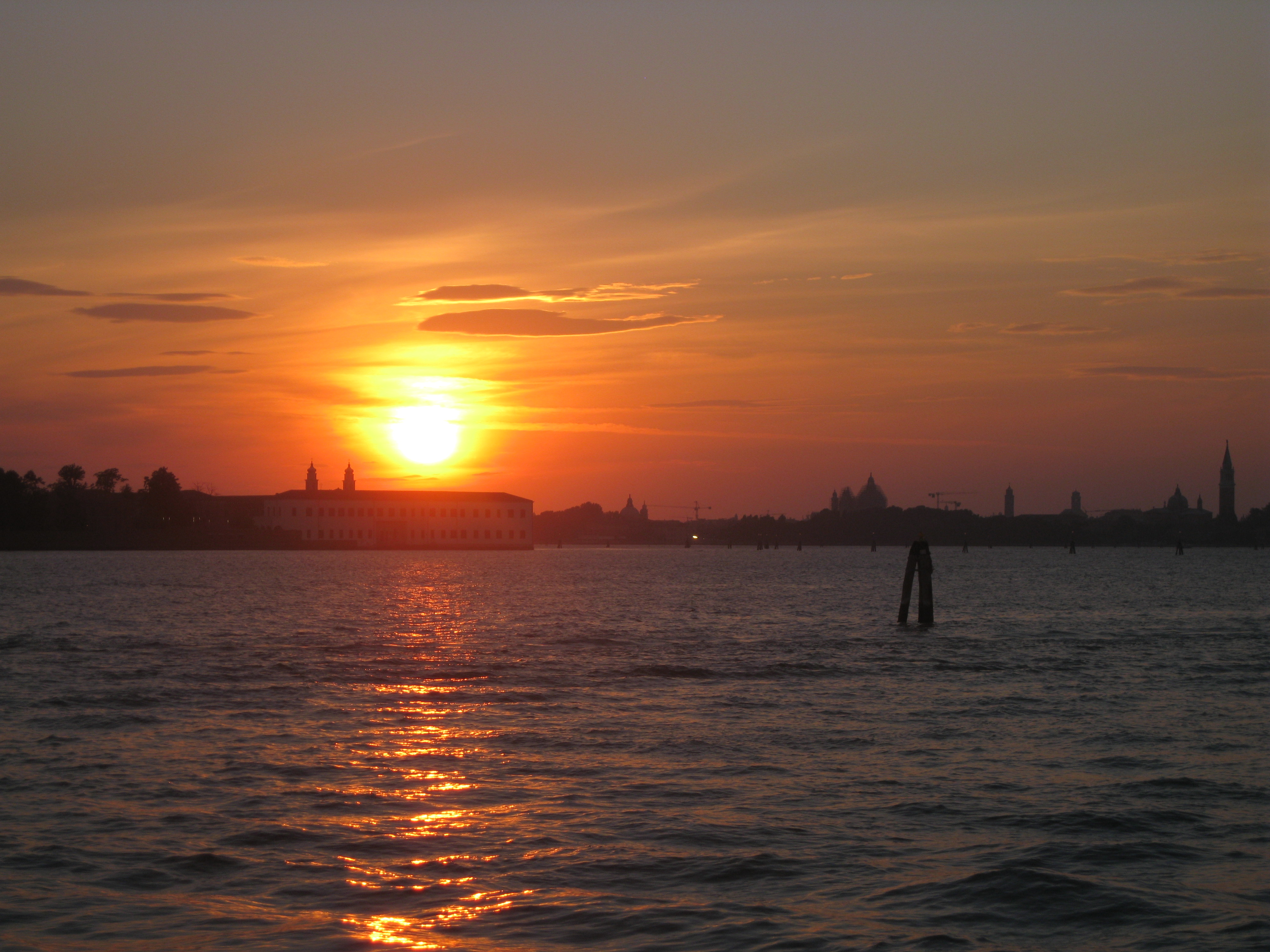 From the restaurant, we walked to a vaporetto and brought tickets. The water bus journey went across to Marguarite island, and stopped at several other places before getting to Piazza Roma and the start of the Grand Canal. We travelled the length of the Grand canal, under the Rialto Bridge and back to Marco place where we started. We decided to stay on the boat thinking it would take us back to the bus station, but instead it went to the Lido and we all had to get off the boat. As we were now on the Lido, we decided to walk along the bars and cafes and have a drink. By now it was getting dark and the sun had just set over Venice.