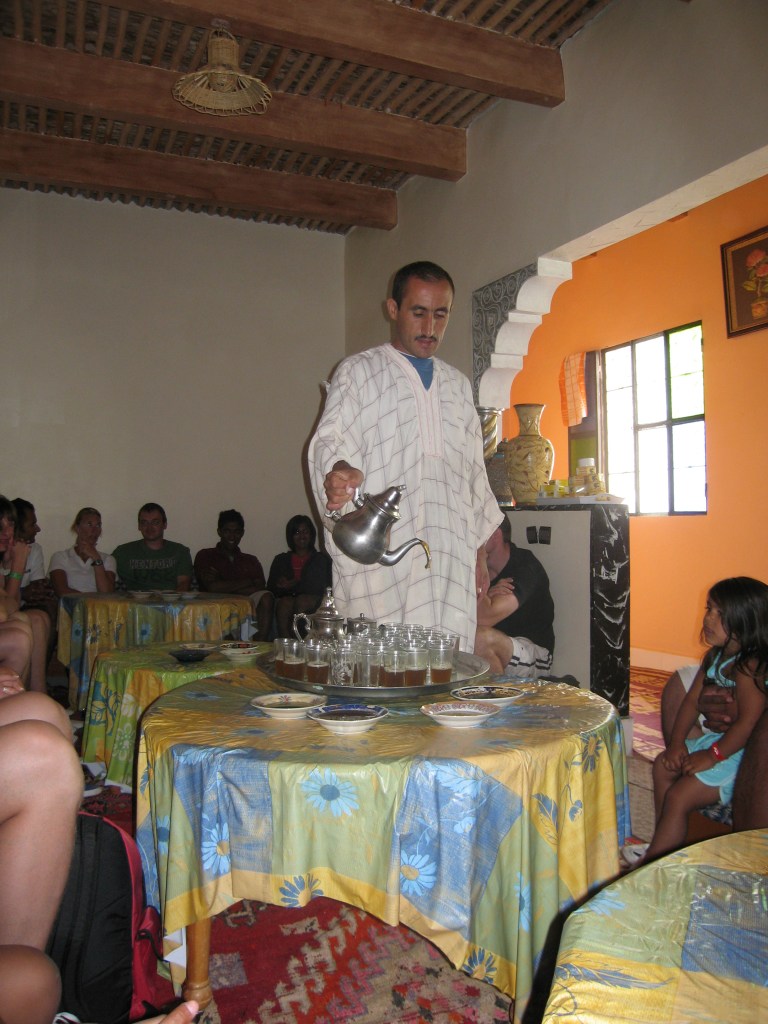 With several photo stops en-route, after a couple of hours we stopped in a tiny village. Immediately, several small local children appeared, with dirty and torn clothes and watched as us tourists obediently followed one of the drivers through a narrow pathway, round some buildings, past a woman washing her clothes in a stream and into a large Moroccan style room.