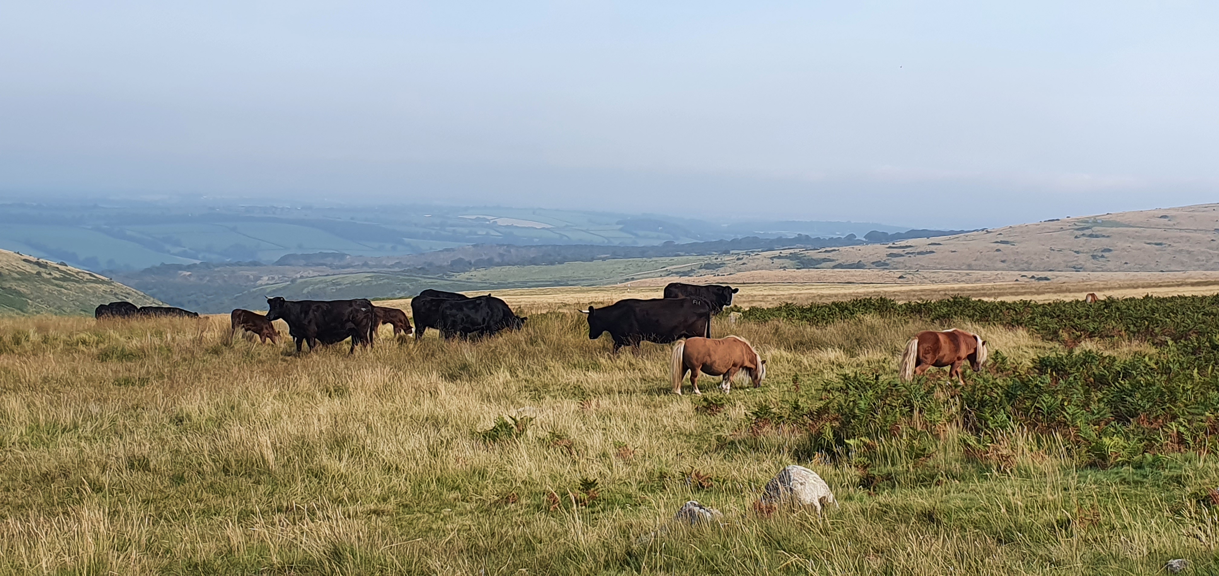 Passing cattle and ponies of Dartmoor National Park.