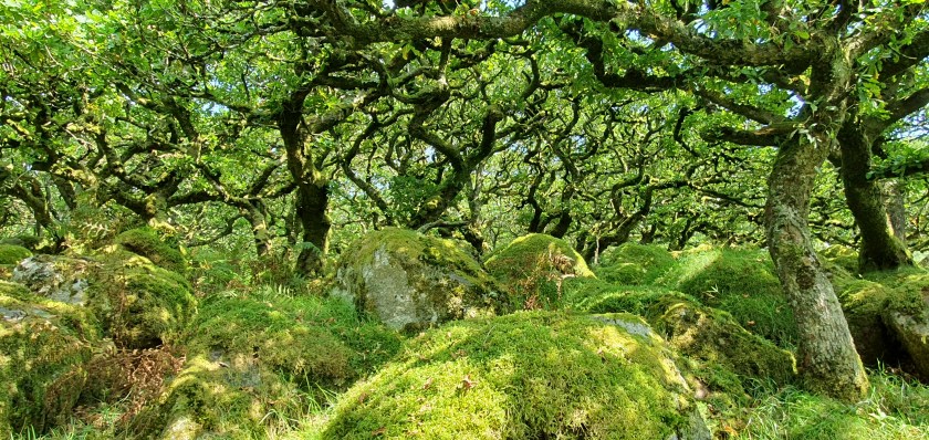 Growing through boulders at an altitude of 380 meters, the Black-a-Tor Copse is one of three ancient high altitude woodlands on Dartmoor. The climate has stunted the growth of these small English Oak trees and thanks to the strong winds blowing through the valley some of them also lean east and west. The copse is also home to 44 different species of moss and rare lichens.