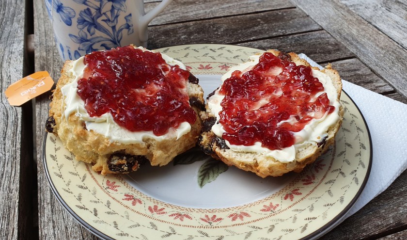 Flo didn’t participate in this walk however we had a lovely surprise when we returned to the holiday house as she had brought fresh home-made scones from a local farm shop together with jam and clotted cream for us all. Cream teas are a speciality of Devon and Cornwall and are served in many tea rooms across both counties. This was a treat as we sat in the sun in the sheltered courtyard of the Sandmartins holiday house.