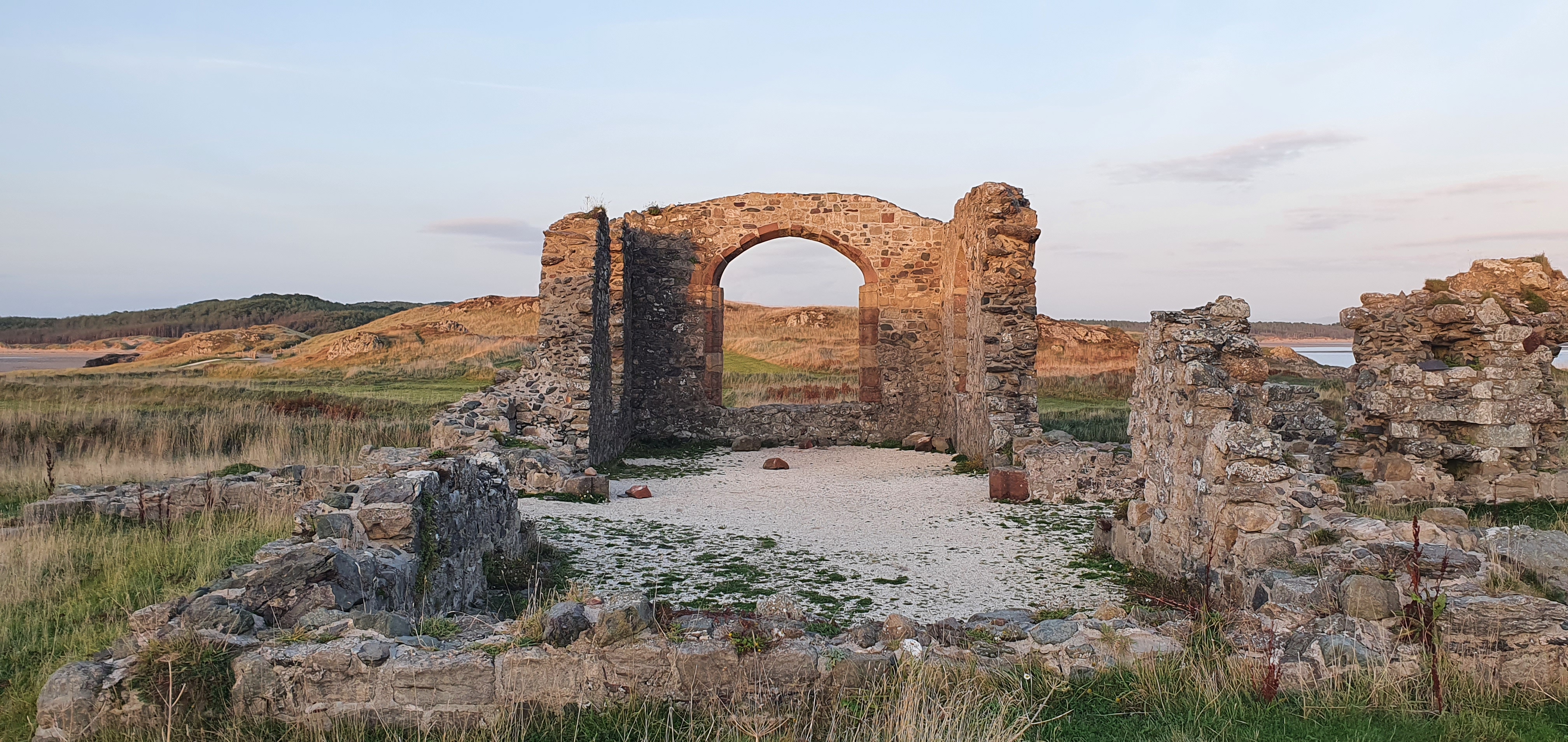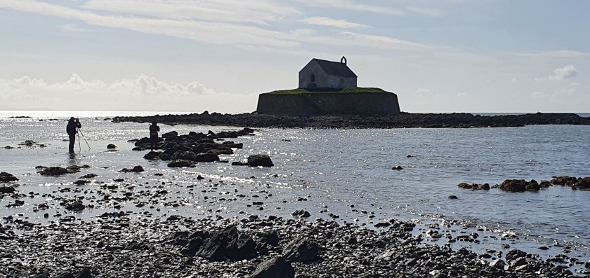 We had met at the car park and after parking 3 cars, all 7 of us (and 3 doggies) were on our way, walking for about 10 or 15 minutes down a track towards the beach. The tide was in meaning we were unable to walk across the causeway to have a look at the church. The causeway follows the line of rocks (in the picture above) which leads to the island.