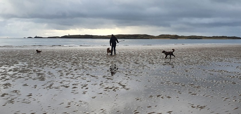 We bypassed the paths towards the forest and took the short exit through the dunes and straight onto the beach. From here we could see Llanddwyn Island with the lighthouse at the end to our right. Dogs are allowed on any part of Traeth Llanddwyn (Llanddwyn Beach) between 1st October to 30th April although there are restrictions in the summer. Ralphy, Kash and Jess had a brilliant time running around the massive expanse of sand. There was a small number of people on this beach, mainly also dog owners but it was still fairly deserted.