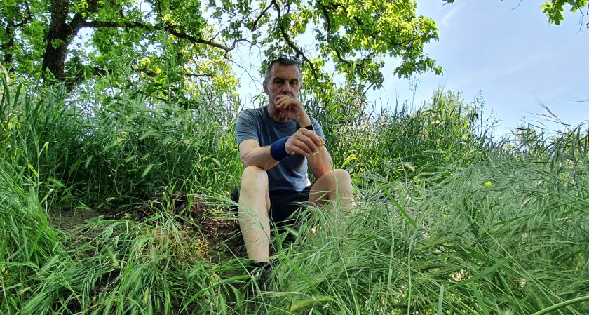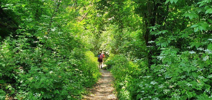 At 1 pm it was time for a lunch break. We were in the middle of nowhere so went slightly off the path into a wooded clearing… well, it wasn’t really cleared – we sat in some long grass that we flattened down to make a comfy picnic spot! And feasted on left-over pizza from the previous night.
