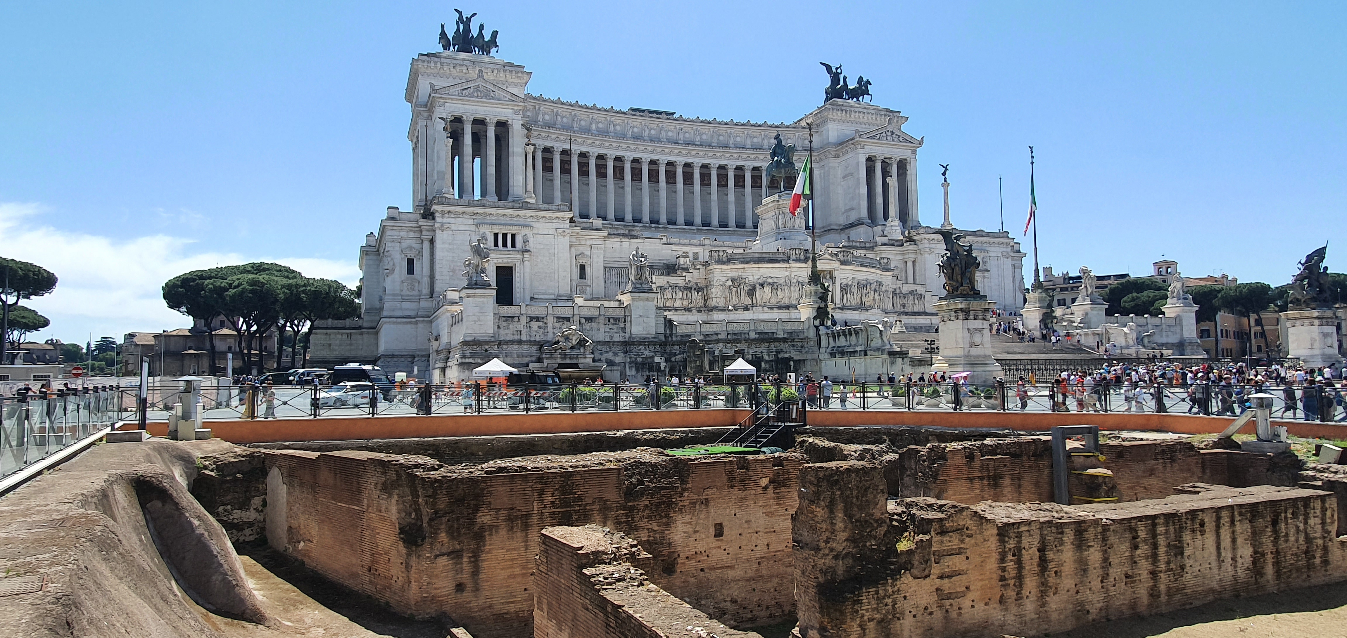 The Piazza Venezia is in the heart of Rome, close to main attractions and with several road intersections. Above are excavations which were uncovered in 2009 and are said to the the most important archeological find in 80 years. These ruins were an art centre and seating for 900 people, built by Emperor Hadrian in AD123.