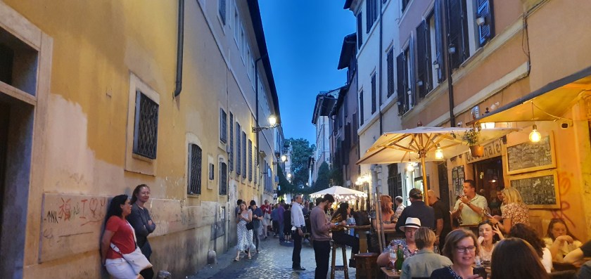 Trastevere is the edgy, urban and bohemian neighbourhood of Rome, similar to the Friedrichshain district of Berlin. We met Russell and Roza in a lively bar before heading to a restaurant at about 9 pm.