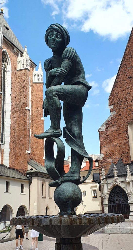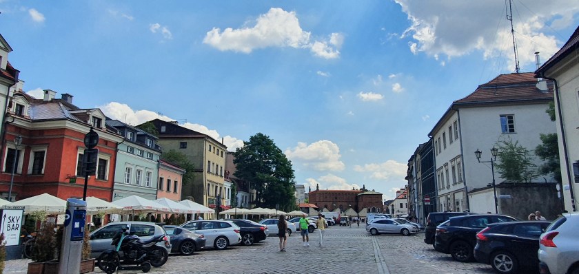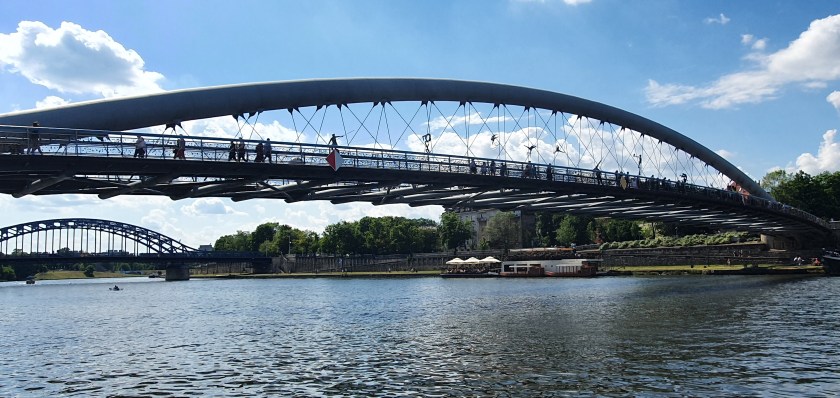 The 140 m long foot bridge provides a pleasant walkway as it links the north and south sides of the city and was our route back to the main square of the Old Town. There are sculptures of acrobats suspended above the bridge; the bridge being named after Father Bernatek, founder of a hospital.