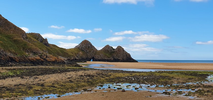 After a mile of walking from the car park, you reach the large sandy beach. The above photo shows why this is called Three Cliffs Bay!
