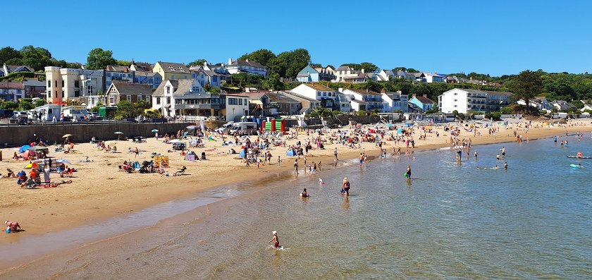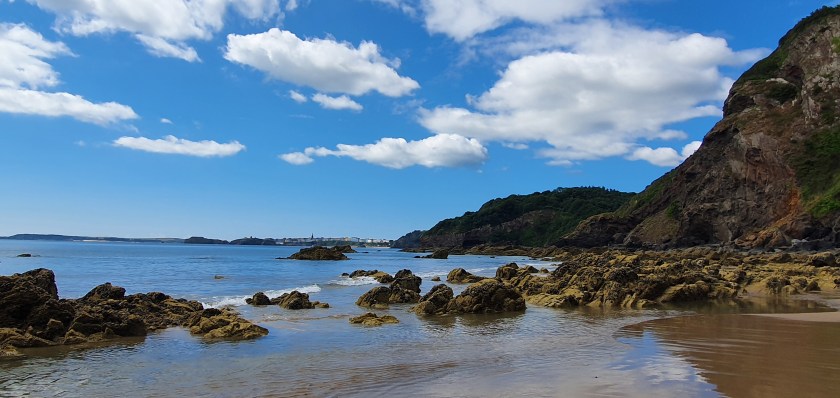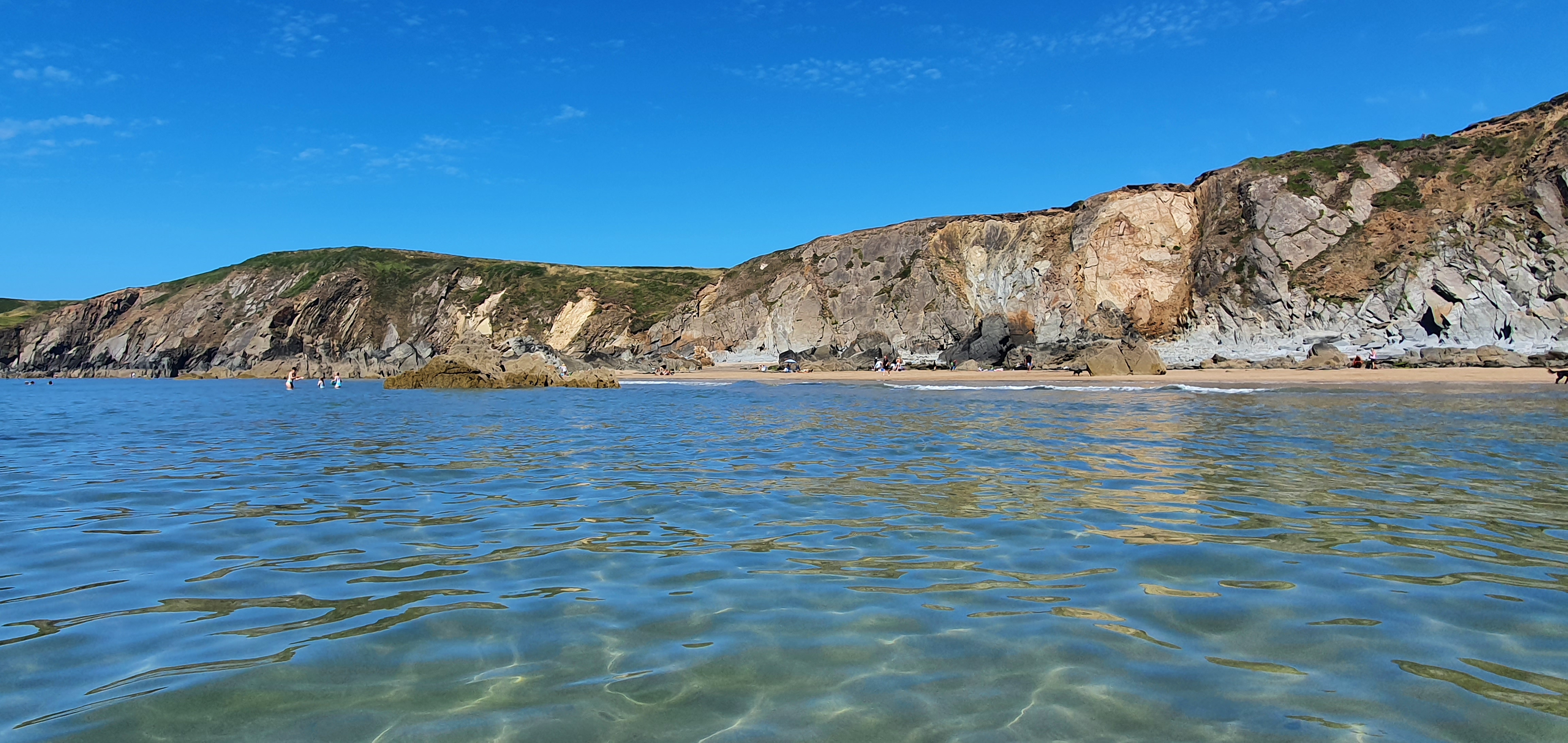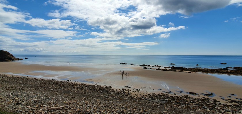 It is helpful to check the tide before visiting a Pembrokeshire beach as they can vary widely! Within a couple of hours the wide expanse of sand had reduced to a narrow strip and we had to move our stuff to the back of the beach! Parts of it become inaccessible making it now impossible to walk along the width of the beach.
