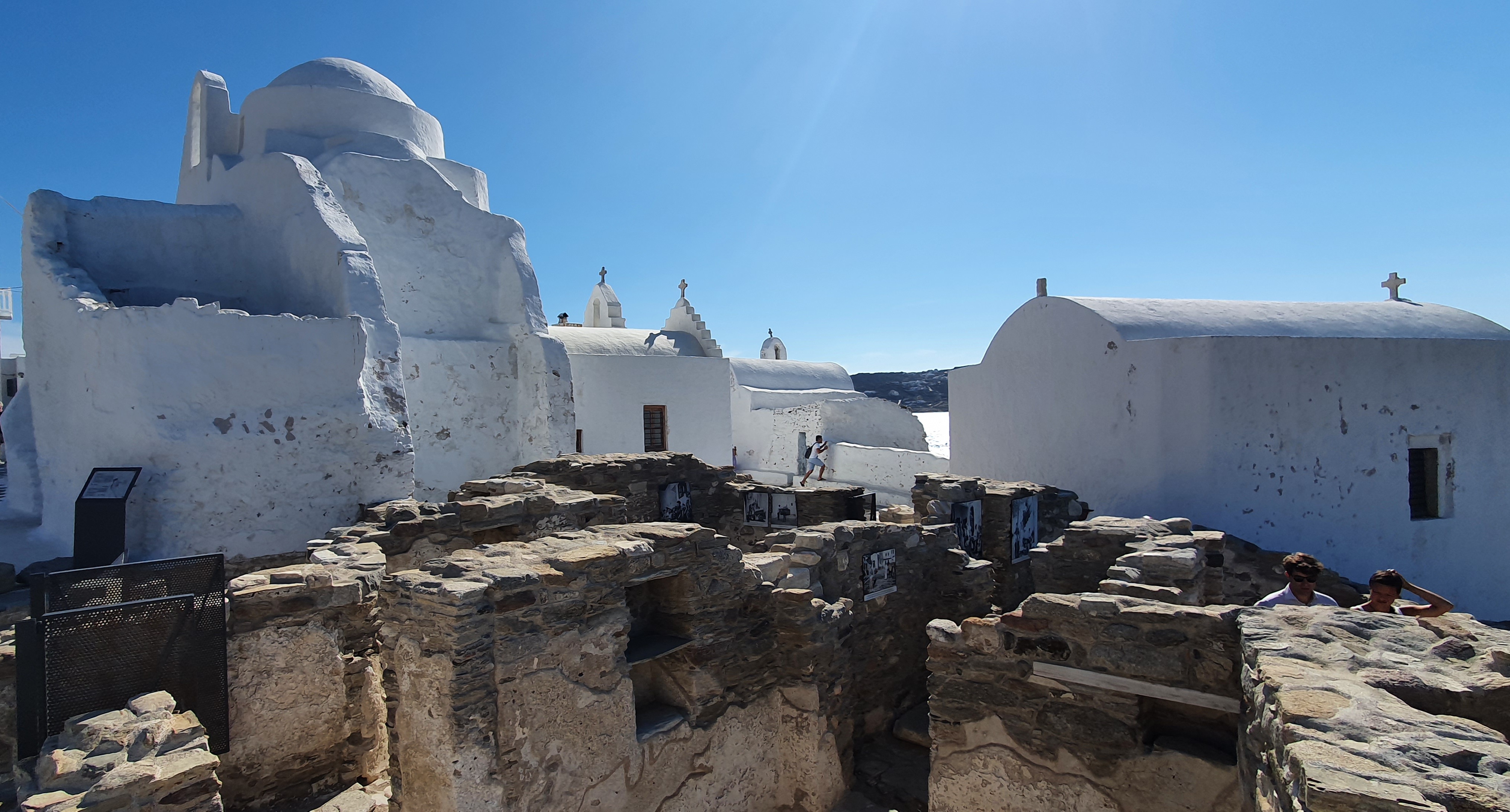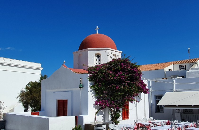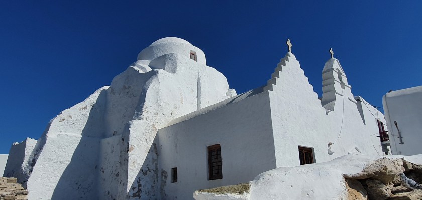 The Church of Panagia Paraportiani can be found in the Kastro neighbourhood (very close to Little Venice). This church was opened in 1475 and is right next to the sea. It’s name means ‘Our Lady of the Side Gate’ as the entrance is at the side!