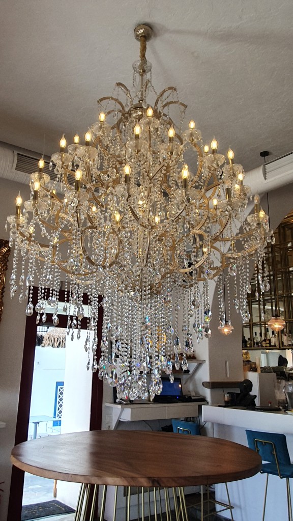 Time for a drink, or a refreshing sangria to be exact! We found a little respite from the tourists in the first floor bar of the TownHouse a small boutique hotel in the heart of the town. This was somewhat luxurious with its comfy balcony seating area overlooking Manto Mavrogenous square and its plush interior and massive chandelier!