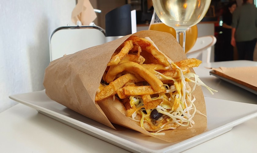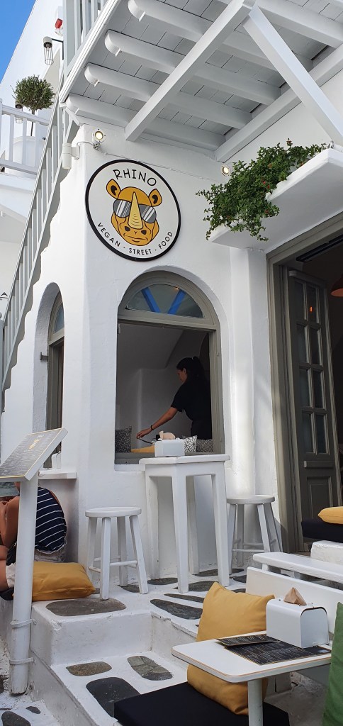 We enjoyed lunch on our first trip to Mykonos Town in Rhino Vegan Street Food where we had a cute little window seat! I ordered a ‘Black Rhino wrap’ for the reasonable cost of just 4.90 euros. This contained jackfruit and potatoes (which turned out to be chips)!