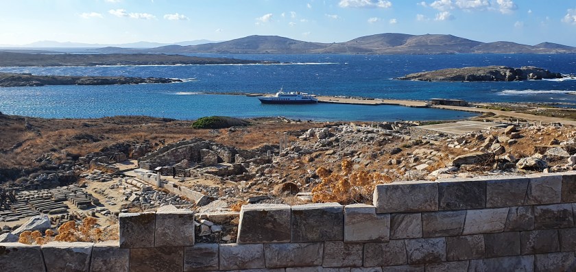 Above in the background is the fairly large boat which had taken us across to Delos. In the foreground is a marble wall which is of similar construction to those built by the Inca’s in Peru.