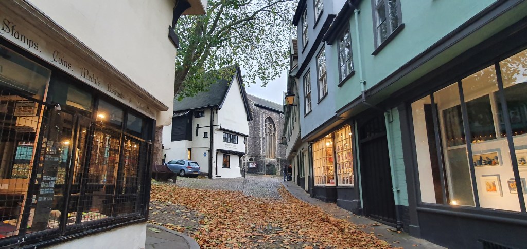 16th century Elm Hill contains a range of quaint shops and cafes. The autumnal weather was rather dull when we visited on this day, but a drink and snack in one of the cafes was a lovely warm and welcoming experience.