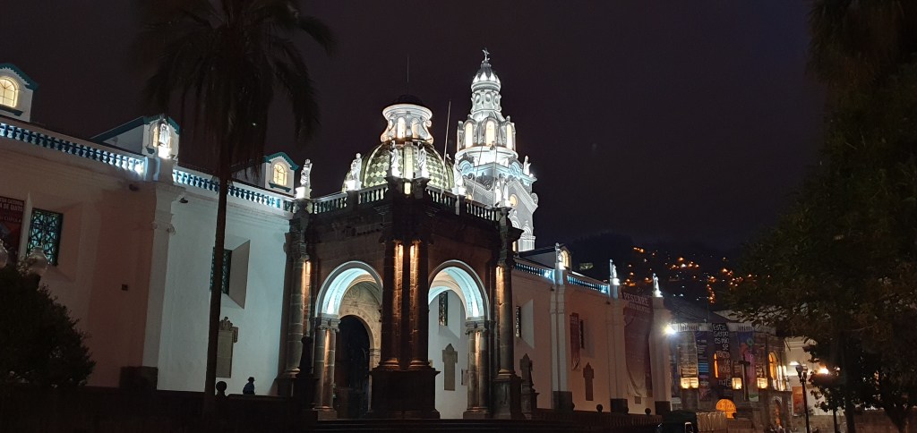 Once we had settled in, Leo our guide took us on a short orientation tour of the old historic centre of Quito. By now it was just after 6 pm and dark. Being close to the equator, there is not much of a difference throughout the year i.e. at 6 am Quito got light each morning and at 6 pm it got dark.