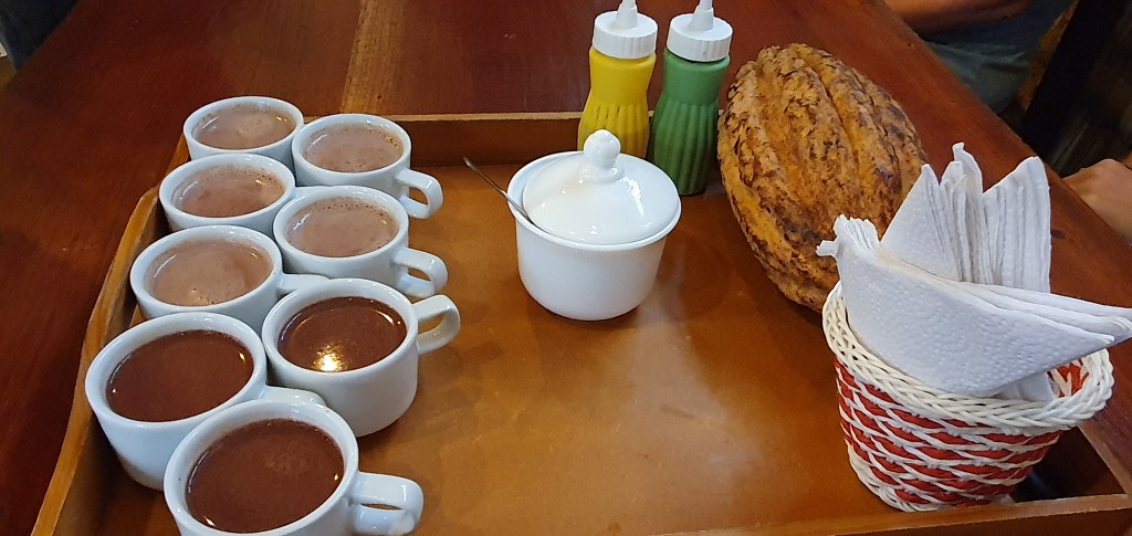 We were not yet done with the treats! We arrived in Mindo and our final activity for the afternoon was spent in the Yumbos chocolate factory. This began with a welcome cup of hot chocolate.