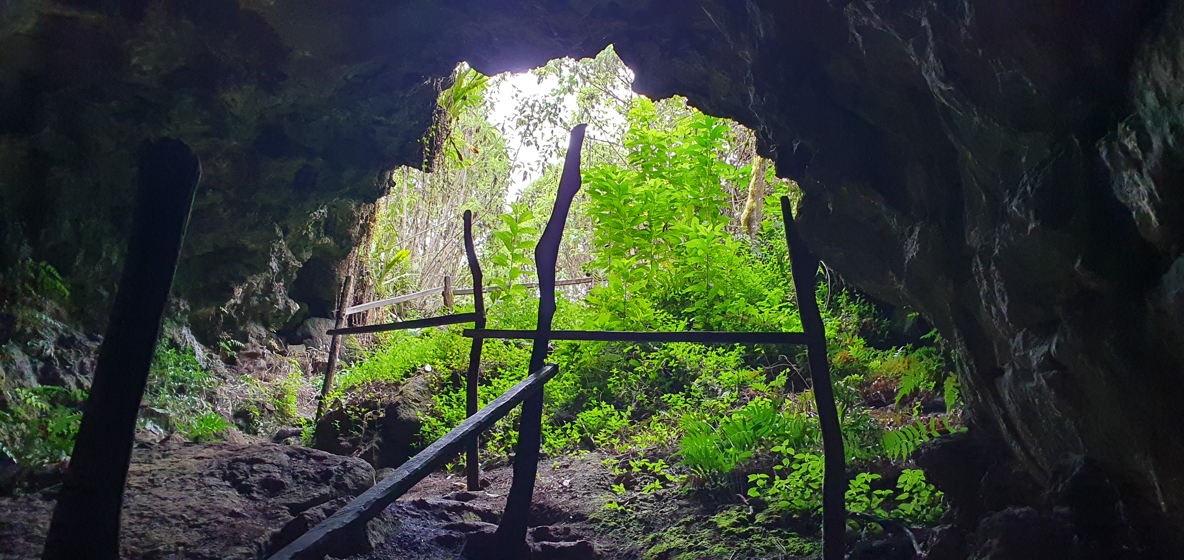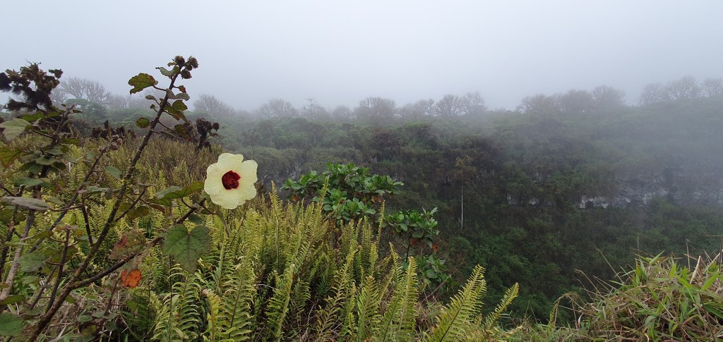 From the airport and our boat to Santa Cruz island our large comfy bus took us to a cloud forest to see two volanic crators known as ‘Los Gemelos’ (the twins). These are both 30 m deep and were formed when empty caverns collapsed on themselves when left empty of flowing lava.