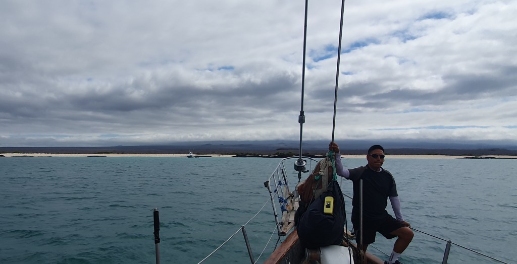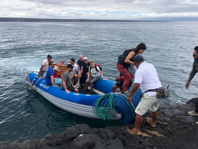 We were all in high spirits sitting in the sun on the deck of the yacht as it sailed towards Seymour Norte island. As we neared the island, the yacht anchored a distance from the shore and we had to disembark back onto the dinghy which took us to the small rocky island.