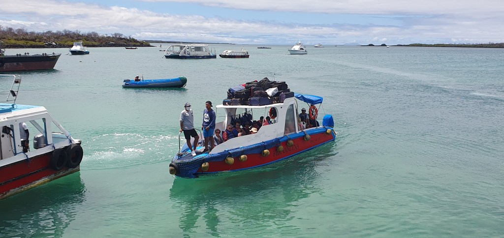 Above is one of the small taxi boats which take passengers and their luggage from the airport island of Basra to Santa Cruz island. We watched nervously hoping none of our cases would fall into the water!