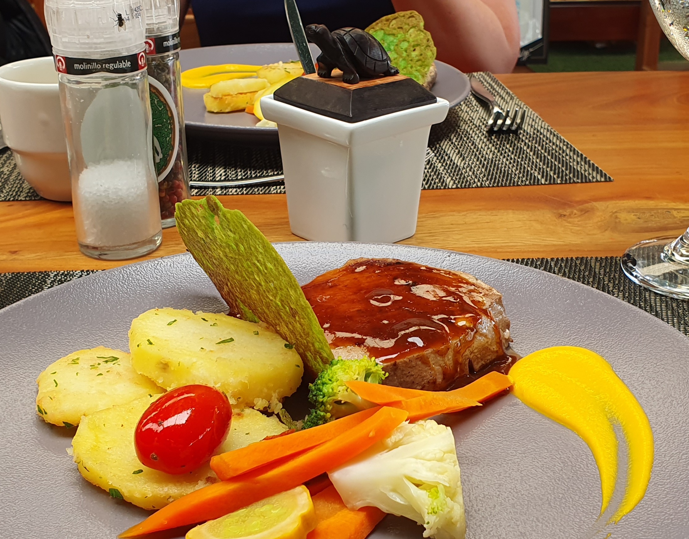 Unsurprisingly, tortoises were a thing throughout the Galapagos… they adorned tee shirts and socks, they were represented as huge tortoise statues and they even sat atop little ornamental sauce pots at the dinner table! At this place throughout lunch we enjoyed organic Galapagos coffee from which we could help ourselves at any time.