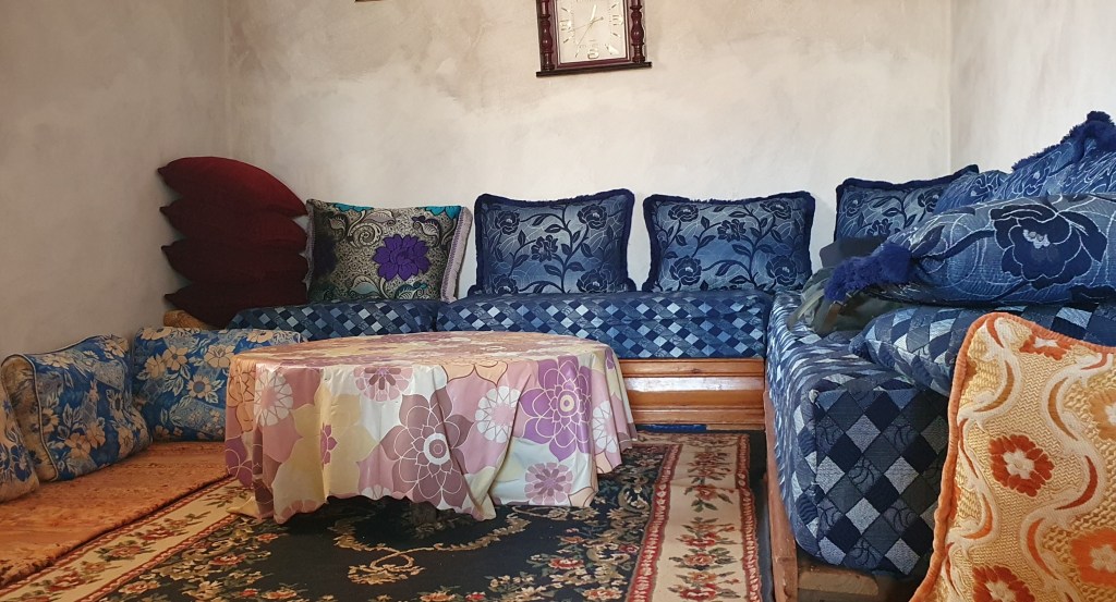In the village we arrived at Hussain’s house for lunch. Naima opened his back gate and we crossed his back yard and entered the back door of his house. We were asked to remove our foot ware (which is a Berber custom) and one by one we washed our hands. No sink was available so this involved a squirt of liquid soap and Naima pouring water over our hands with a bowl underneath to catch the drips.