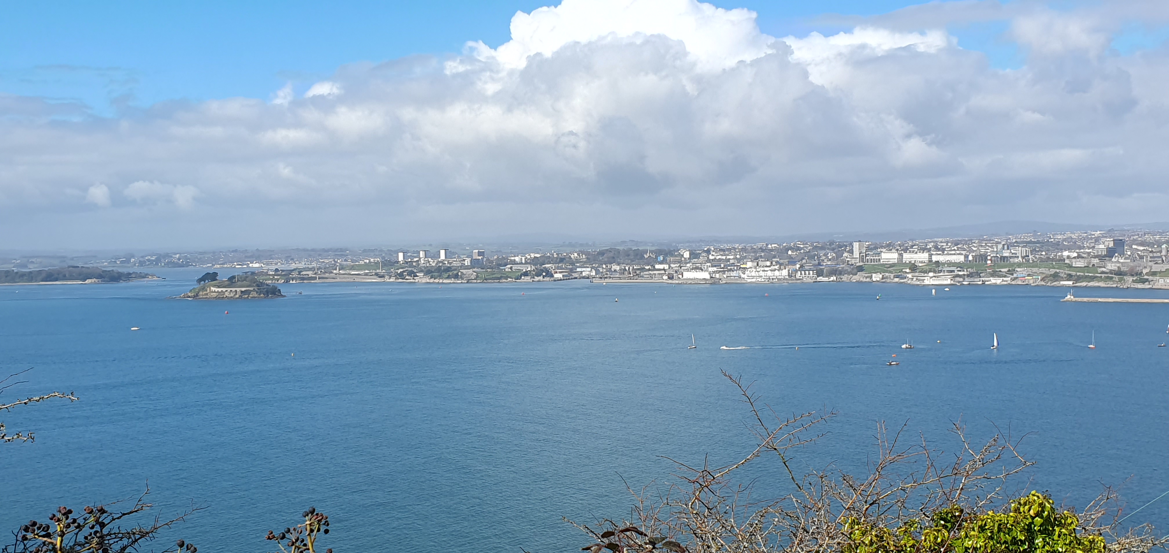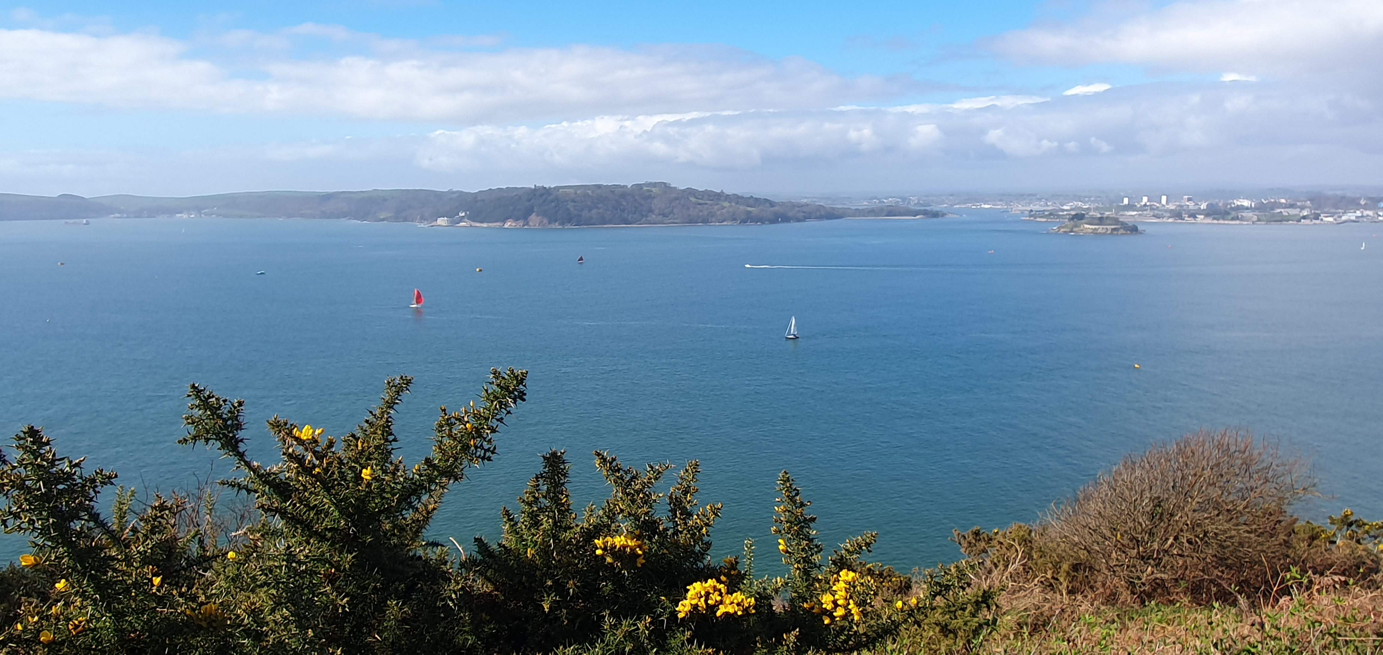 From the coast path, looking across Plymouth Sound, the deep inlet of water above is Mount Edgcumbe which is in Cornwall. The main entrance to Plymouth Sound is from the English Channel and as well as ships, ferry’s sail through on their way to or from Spain and France.