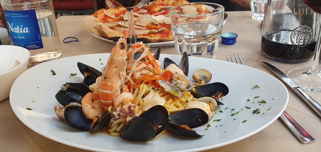 As we neared a restaurant we liked the look of, a quick check of Google maps reviews confirmed the Il Peperoncino with its high score would be perfect for the first meal of our holiday. And perfect it was. A pizza for Chris and seafood pasta for me together with a carafe of Montepulciano. And finished off with a shot lemoncello each 🍋