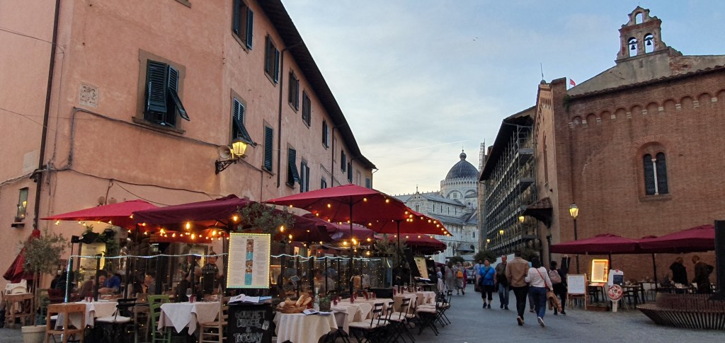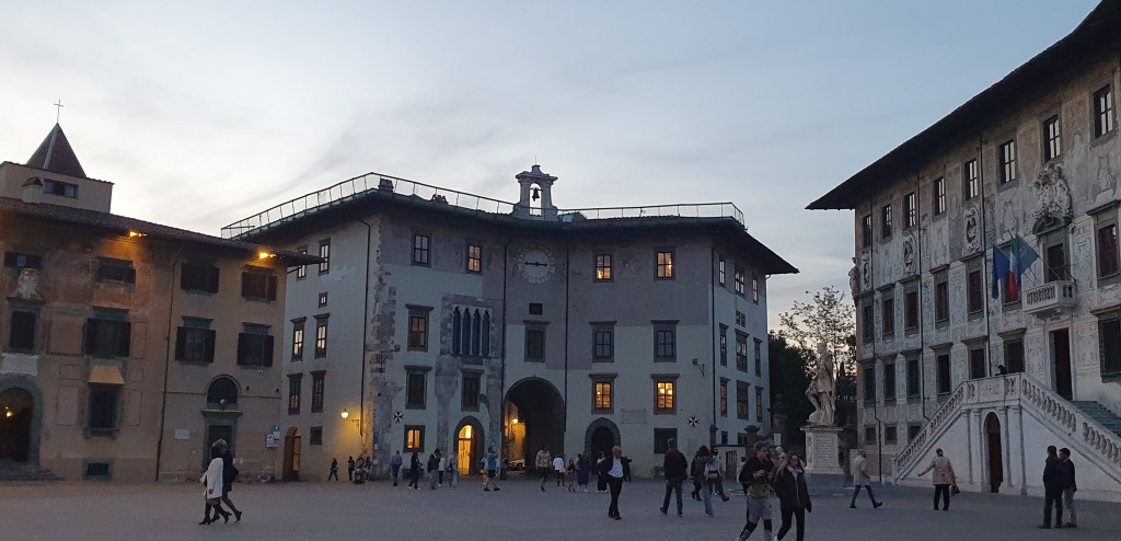 After dinner we walked through the busy atmospheric streets with people sitting outside in the warm evening air and headed towards the leaning tower to have one more look.