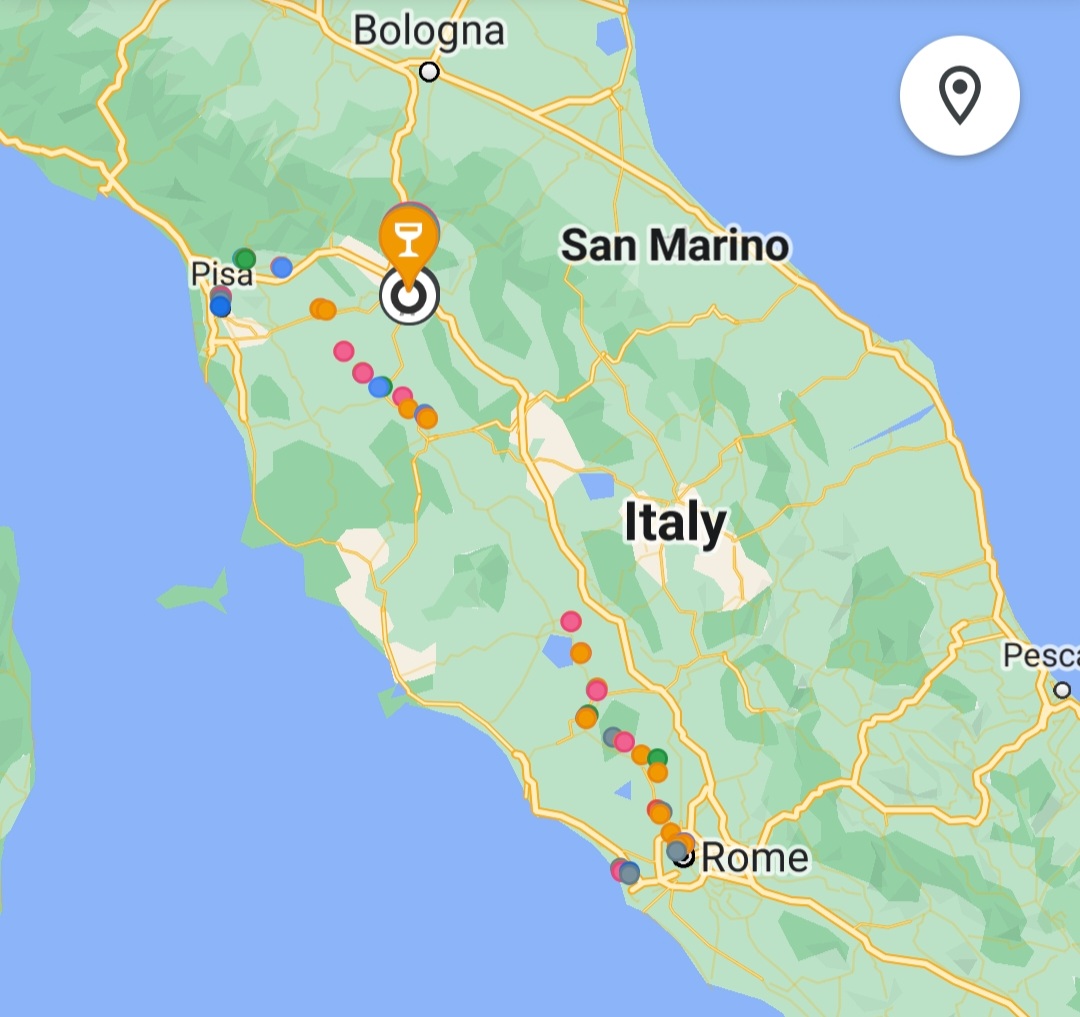 As mentioned above, it would be great to complete the entire Lucca to Rome journey at some point with 5 more days of walking between Siena and Bolsena. The above photo shows the coloured dots marking the two completed sections walked.
