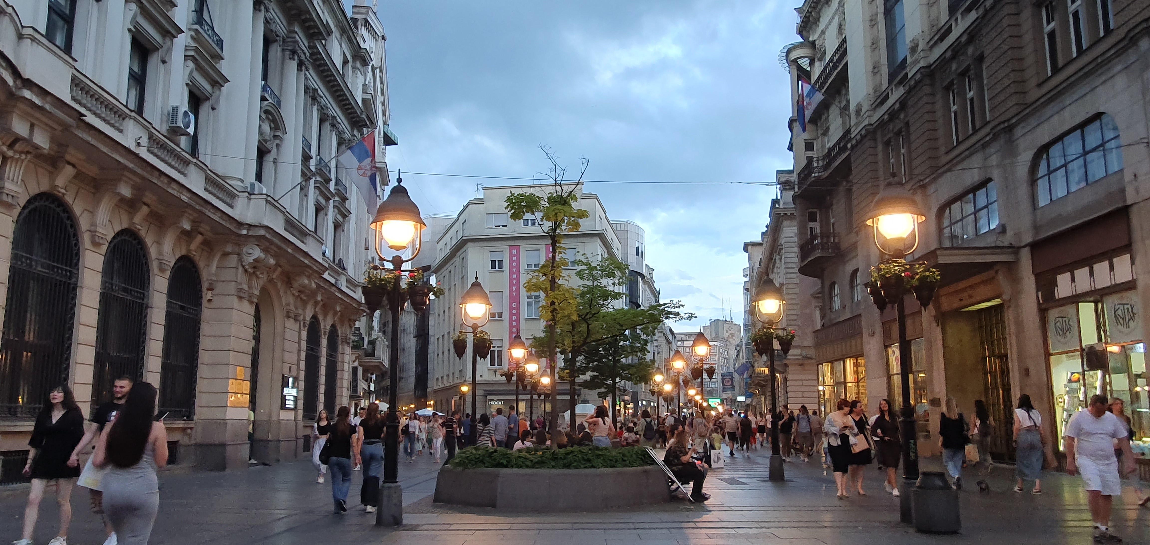 Evening in Knez Mihailov the main pedestrian street was full of people bustling around and sound with a few buskers providing entertainment along the way.