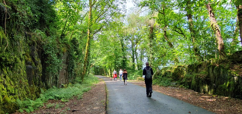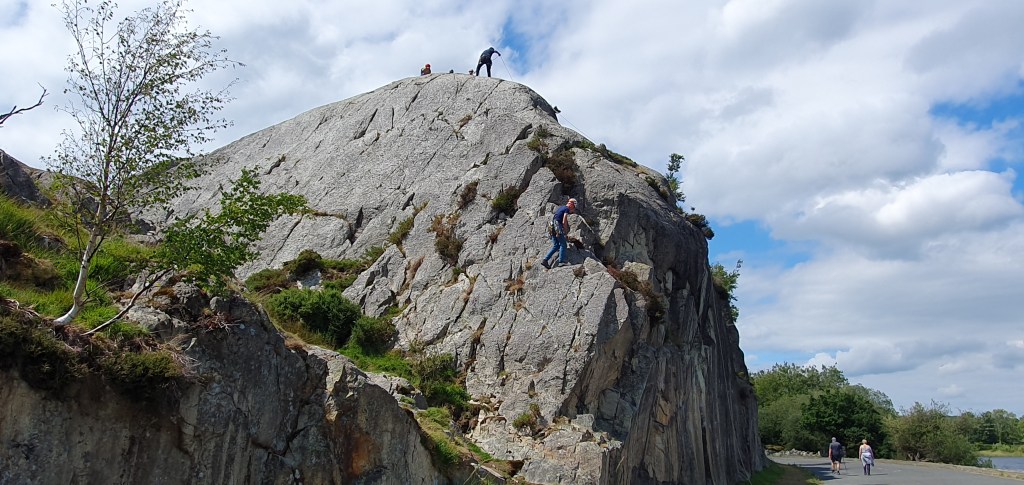 We had to walk under a tunnel, then we had a small section near the road and after crossing the road we were back next to the lake. Shortly afterwards we came across some people abseiling down a steep rock. A sign next to the rock explained this is called ‘Union Rock’ as it is the site where in the 1870’s, 110 quarrymen declared themselves to be union members and used this rock as their meeting place. These meetings led to the creation of the North Wales Quarrymen’s Union.