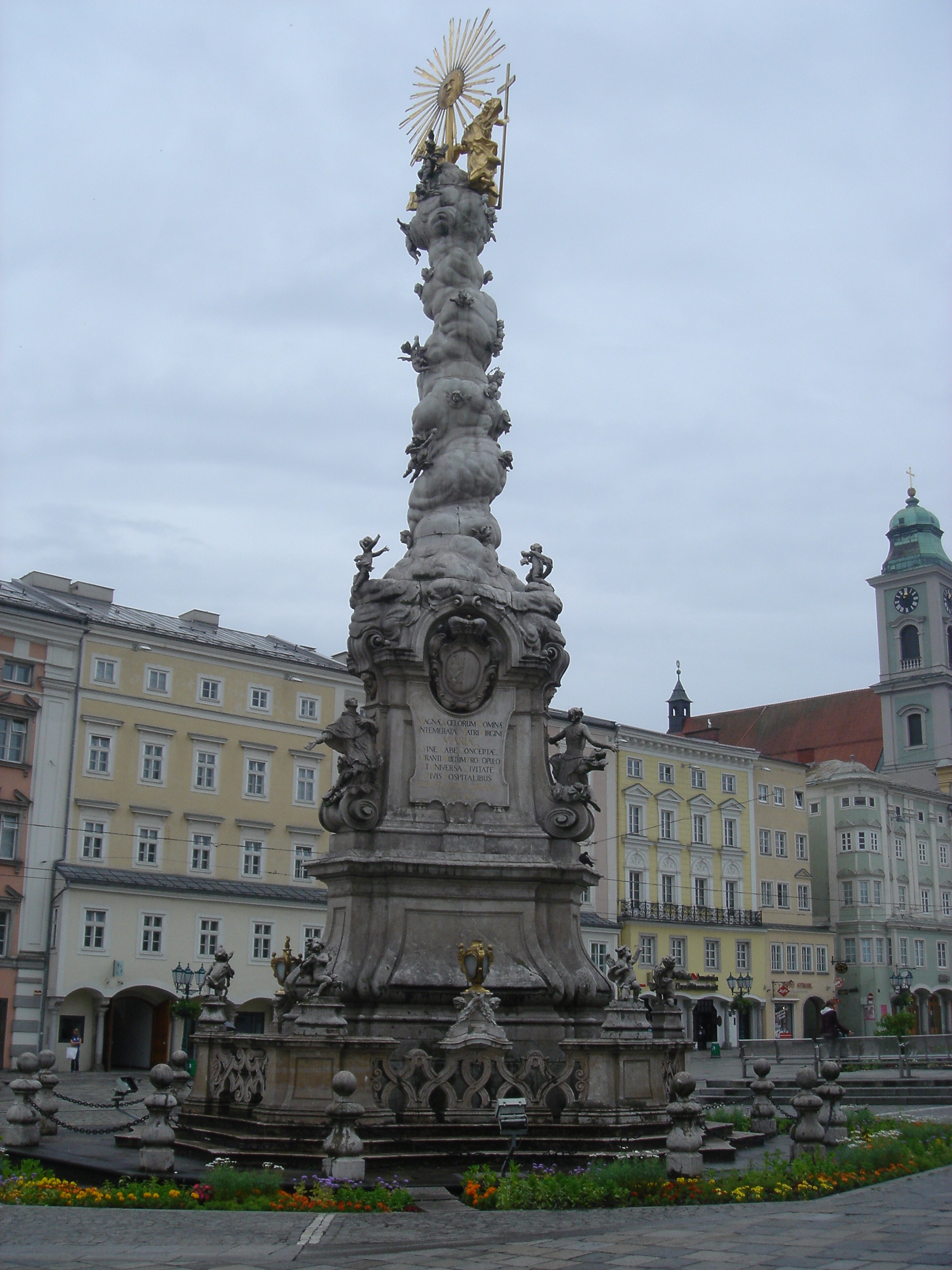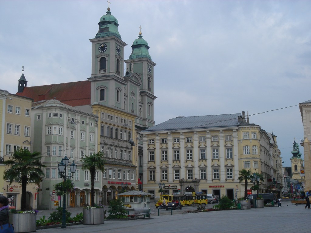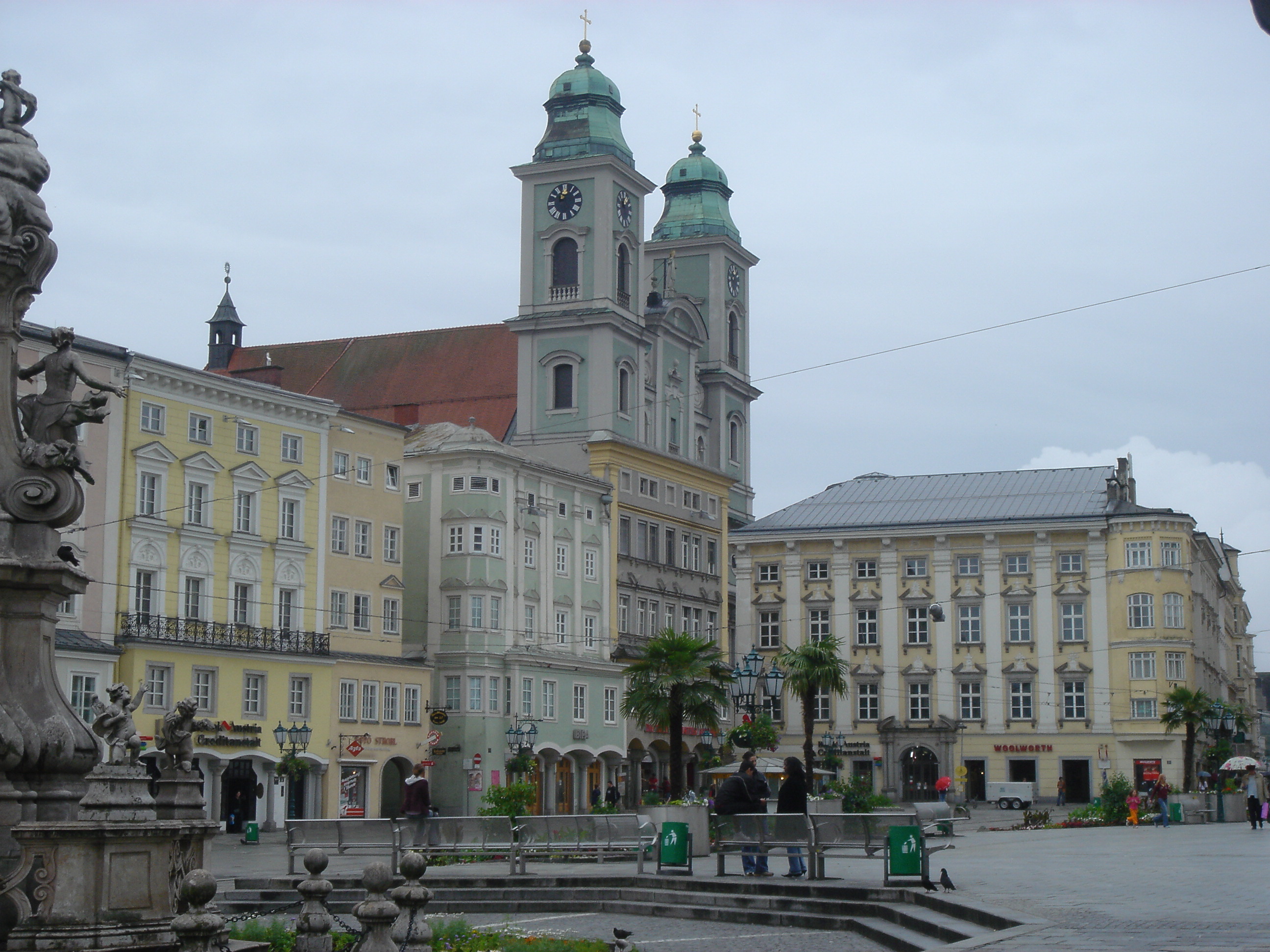 It was still pouring with rain as we stepped off the tram into the main square of Linz. In the rain we set about looking for a camera shop in search of an extra memory card. Even though it was Saturday afternoon some of the shops had closed at midday.