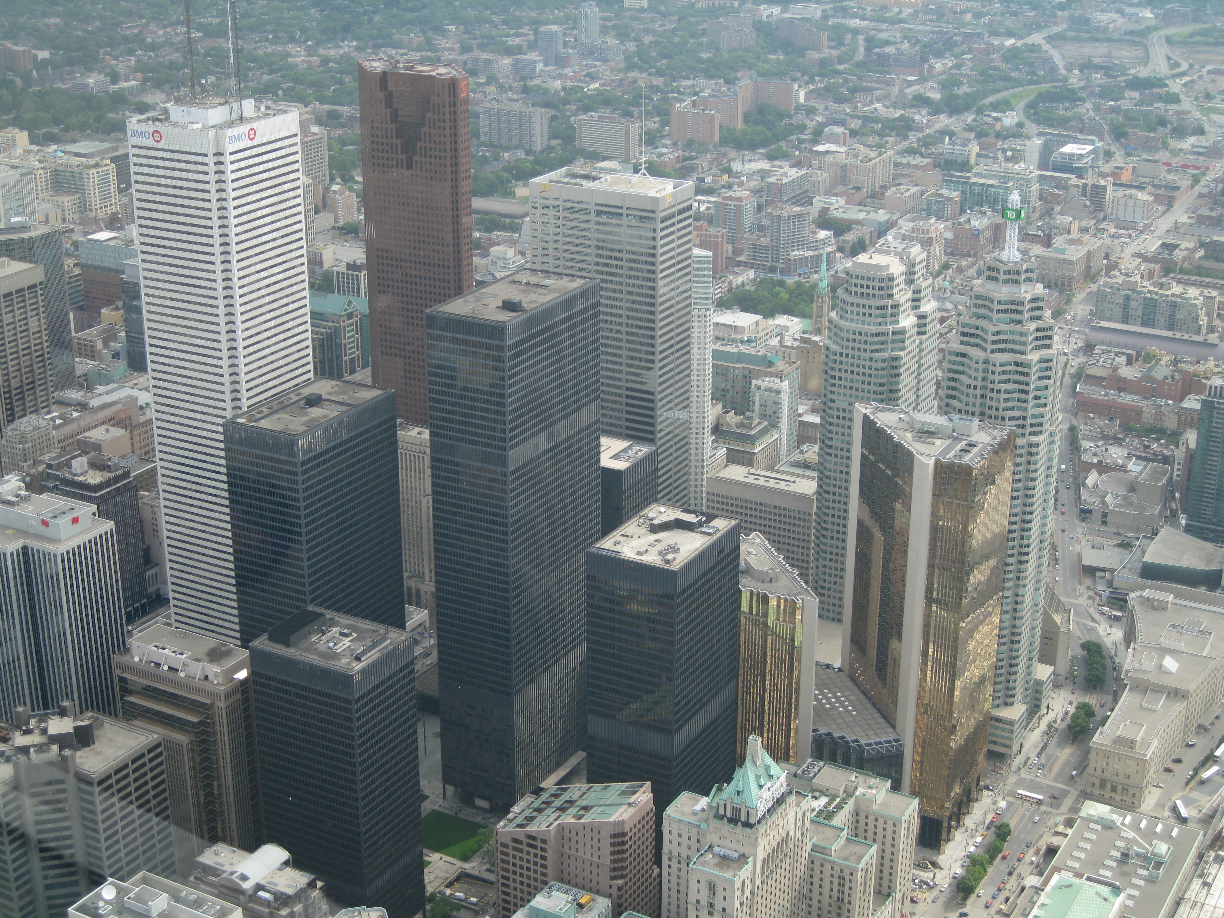Above the Gooderham Building in Wellington Street East is a historical wedge shaped office building.