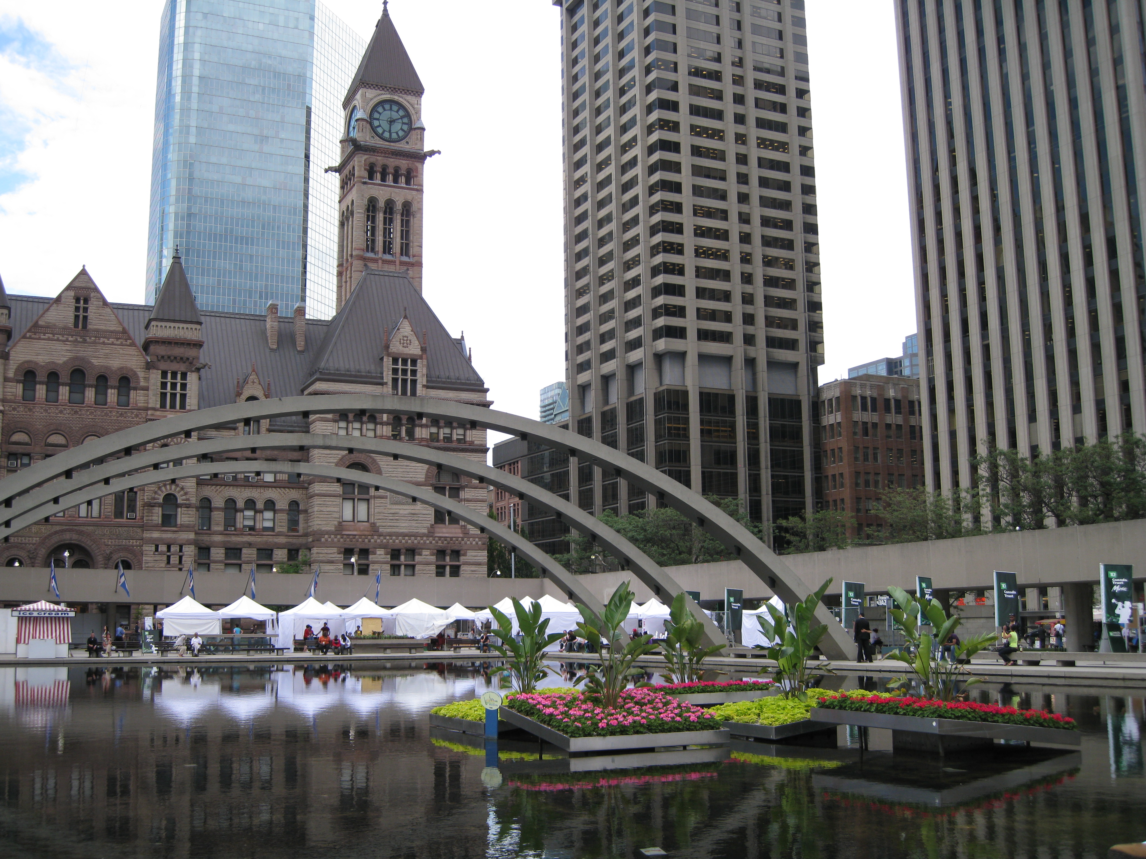 Nathan Phillips Square is a lively buzzing plaza complex which features a reflecting pool. In winter, this is turned into an ice rink. The square holds events, exhibits, festivals and weekly farmers markets. It was named after Nathan Phillips, mayor of Toronto from 1955 to 1962.