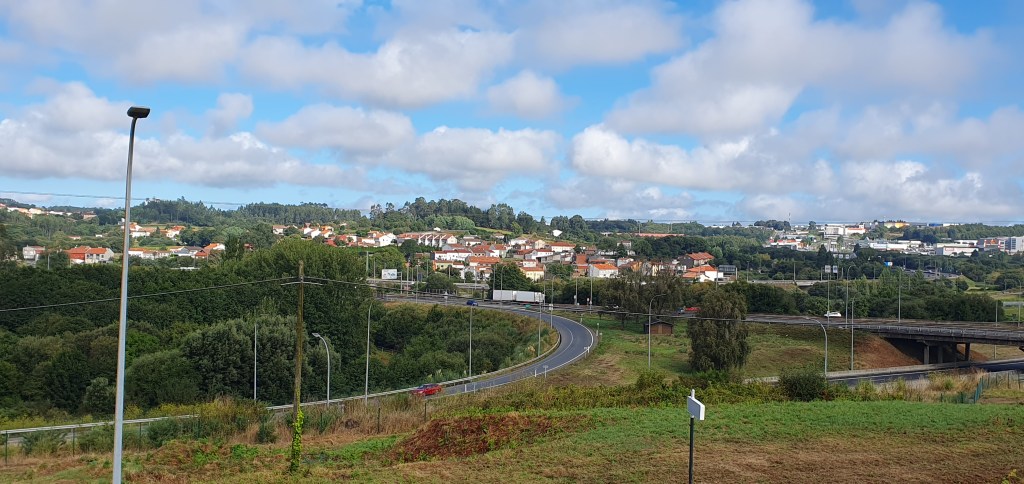 We had reached the hill near the Chapel St Marcos and thankfully by this time the misty drizzle had disappeared and the sun began to shine. This was our first glimpse of Santiago de Compostela ahead.
