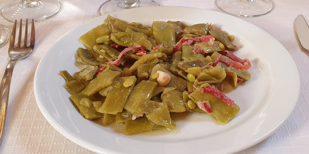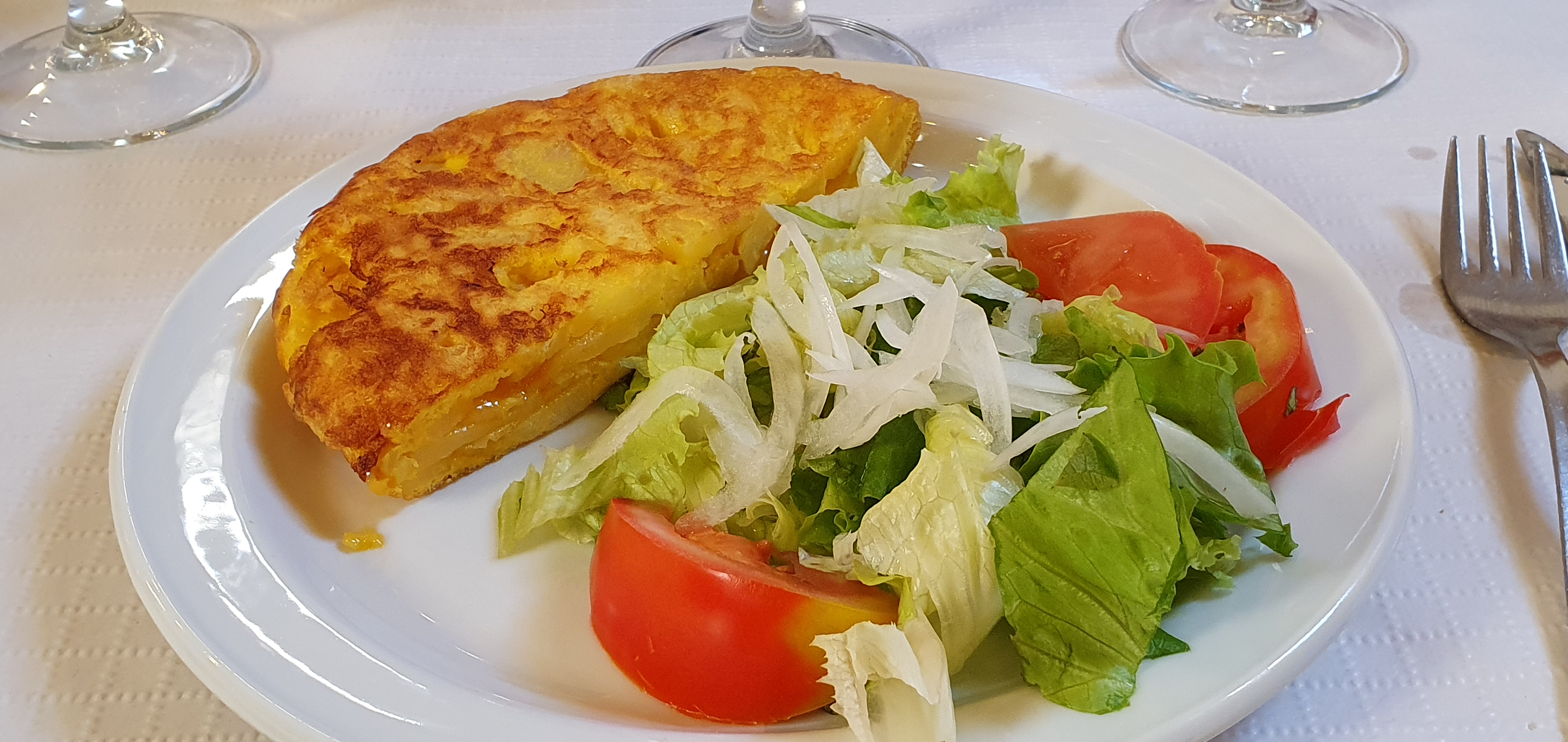 We were shown to a table and for a set price of 14 euros each we had a pilgrims menu. There was a choice between two starters (noodle soup or sauted beans); two mains (tortilla or roast pork) and dessert. Included also was bread, mineral water and a bottle of red wine between the 4 of us.