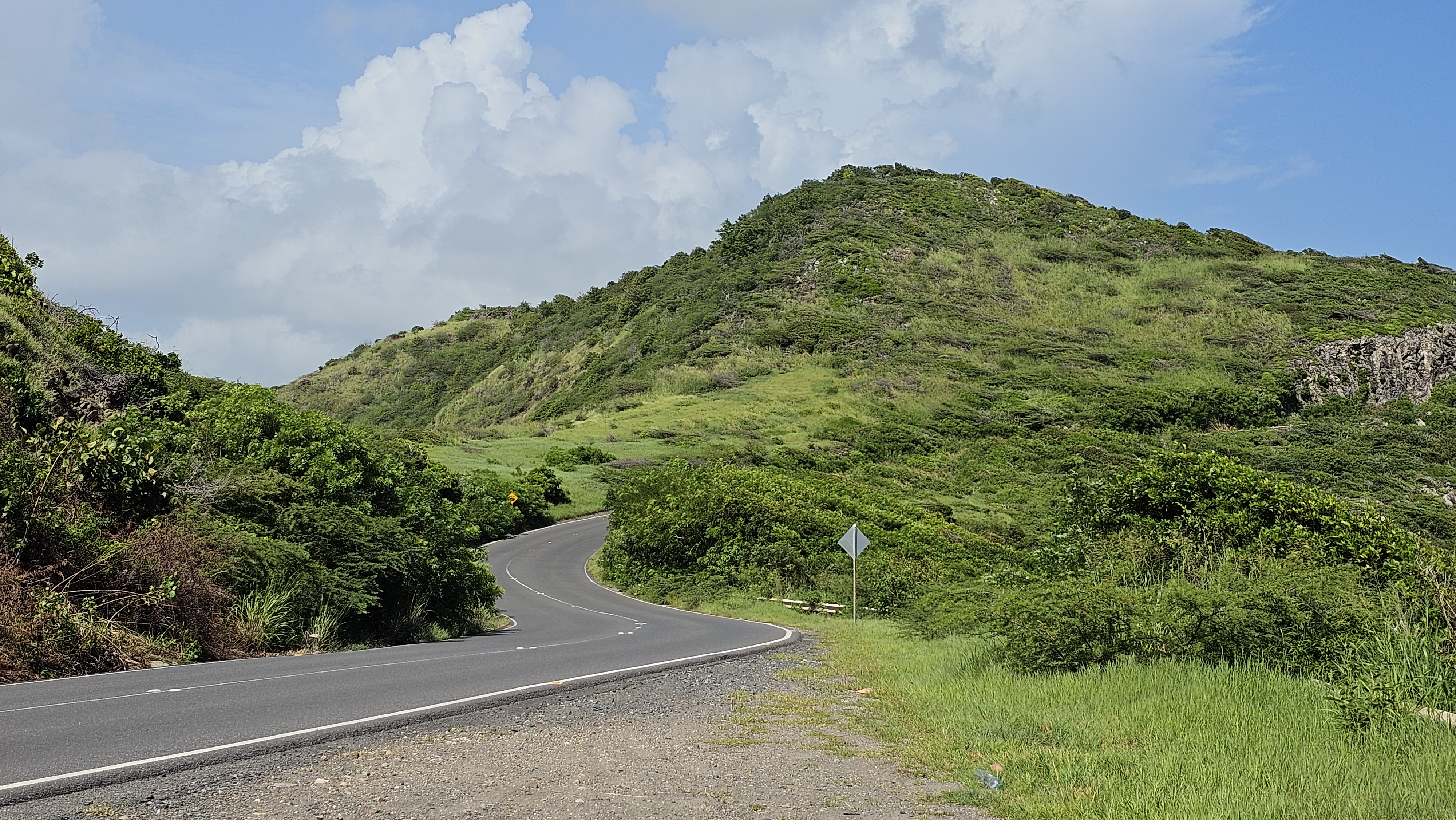 We started our drive to spend the day exploring the southeast peninsula of St Kitts at about 9.45 am and stopped again at Timothy Hill viewpoint. This thin hilly slither of land divides the Atlantic Ocean on left of the above photo and the Caribbean Sea on the right.