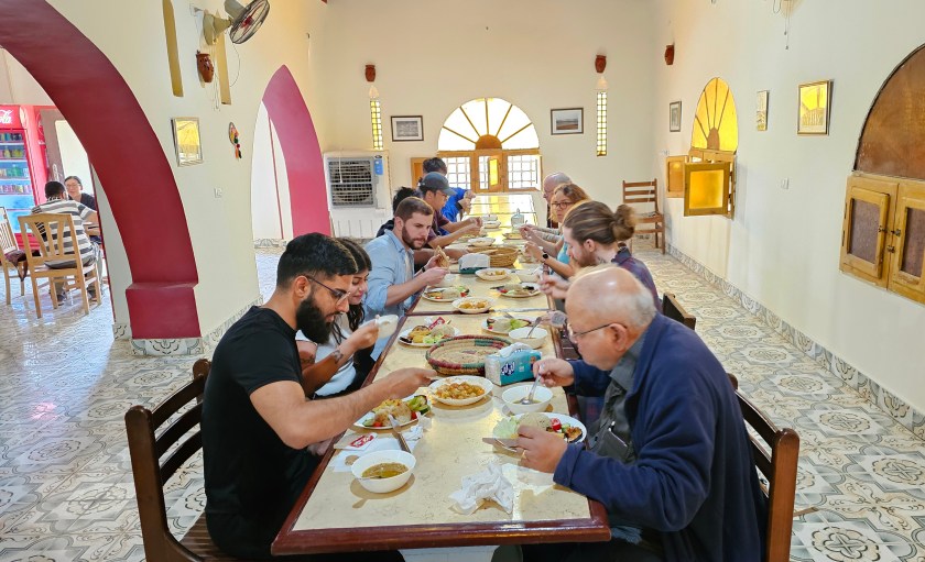 The 11 of us sat at a long table where we were given tasty lentil and vegetable soup with warm bedouin flat bread and a main course (I had the veggie option which was spicy aubergines with rice).