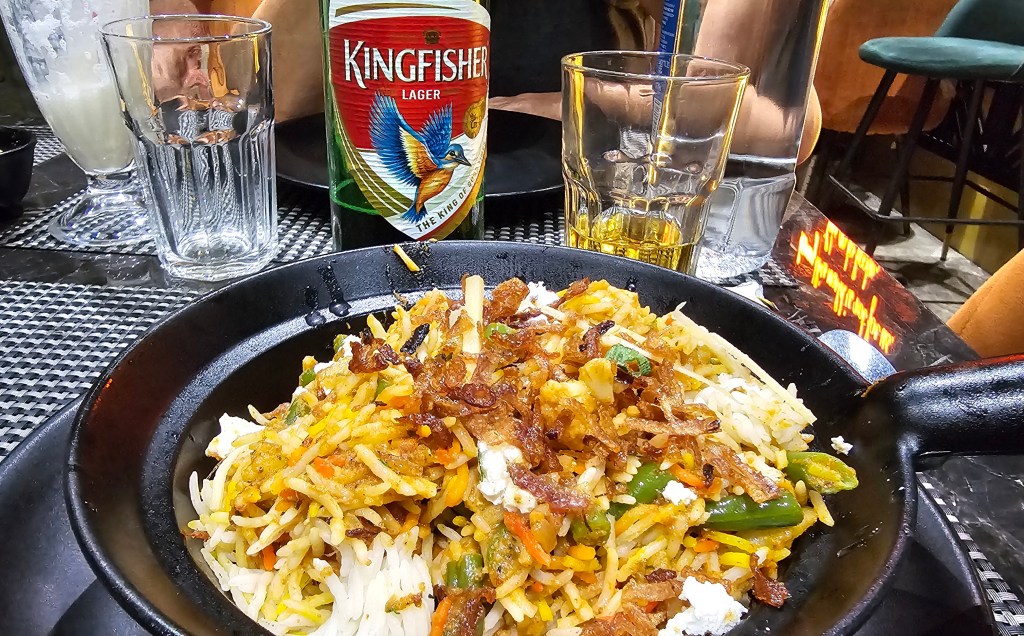 My first curry in India was a superb vegetable biriyani in Hooter restaurant which was a few minutes walk from the Pooja Palace hotel. This and the bottle of Kingfisher was 824 rupees including tax and service charge so just over ยฃ8 in total.