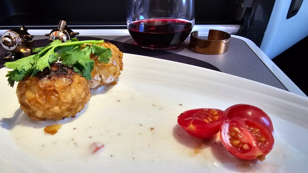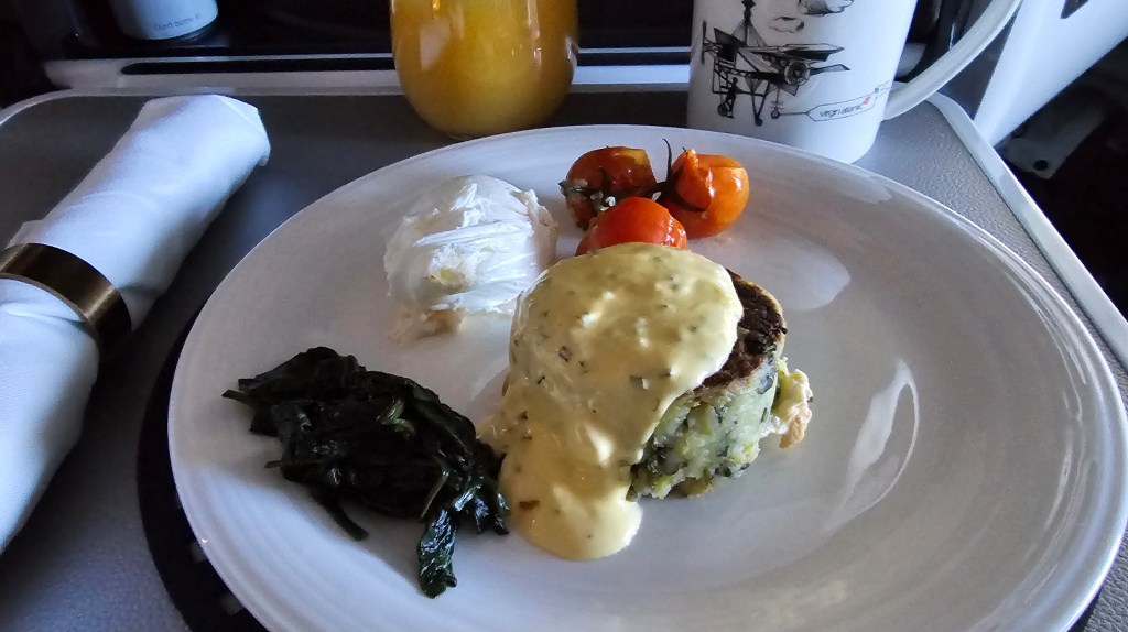 An hour or so before landing and I selected bubble and squeak cake with free range poached egg, chive hollandaise and cherry tomatoes. Yum! Another delicious meal.