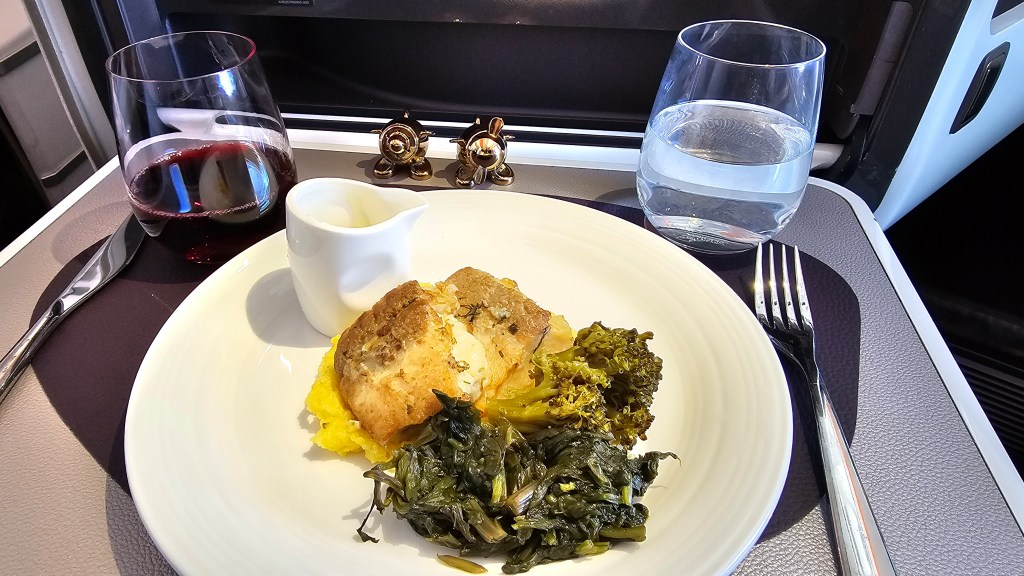 Following an email from Virgin the previous week explaining that pre-ordering your main cuts food waste and enables your first choice I had pre-ordered cod fillet with a buttery capery topping. Which was also delicious.