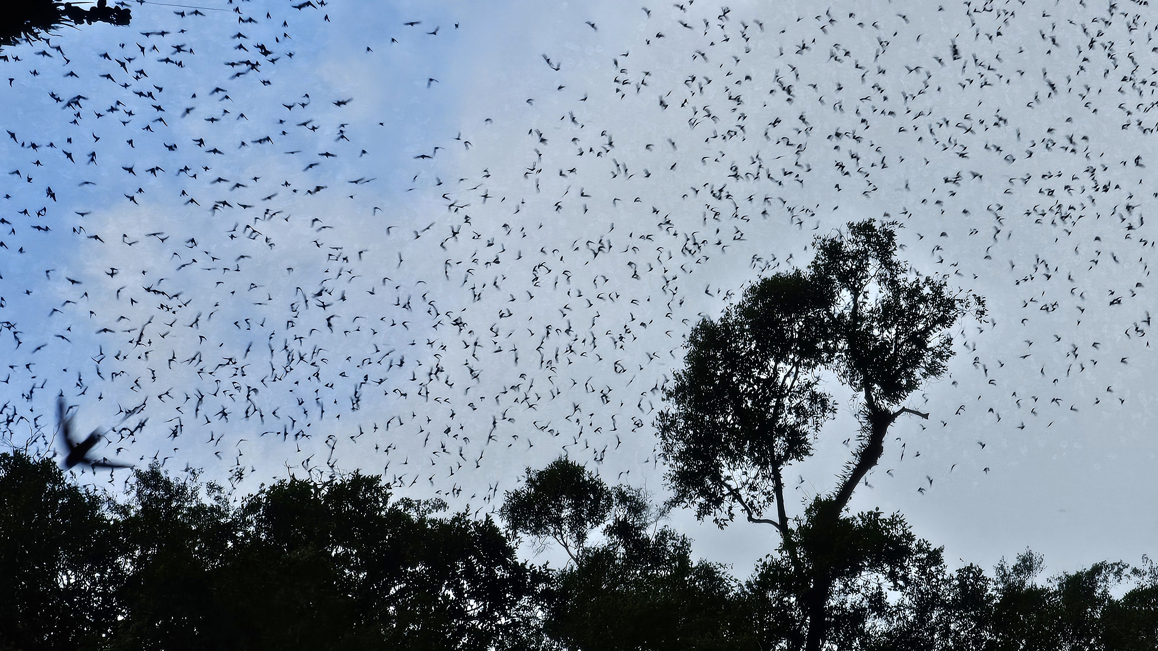 Bats came out from the cave randomly in groups; some of them formed a spiral which is done to deter predators.