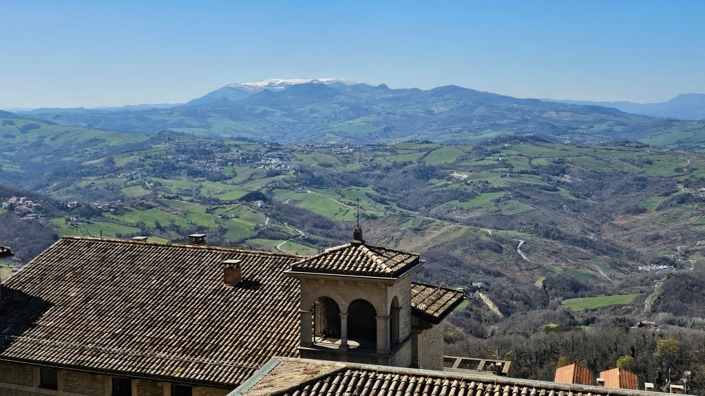 San Marino is located on the slopes of Monte Titano (Mount Titan) and from the old city perched at the top you see extensive 360 degree panoramic views as far as the Adriatic Sea in the distance on one side and snow capped Apennine mountain range on the other.
