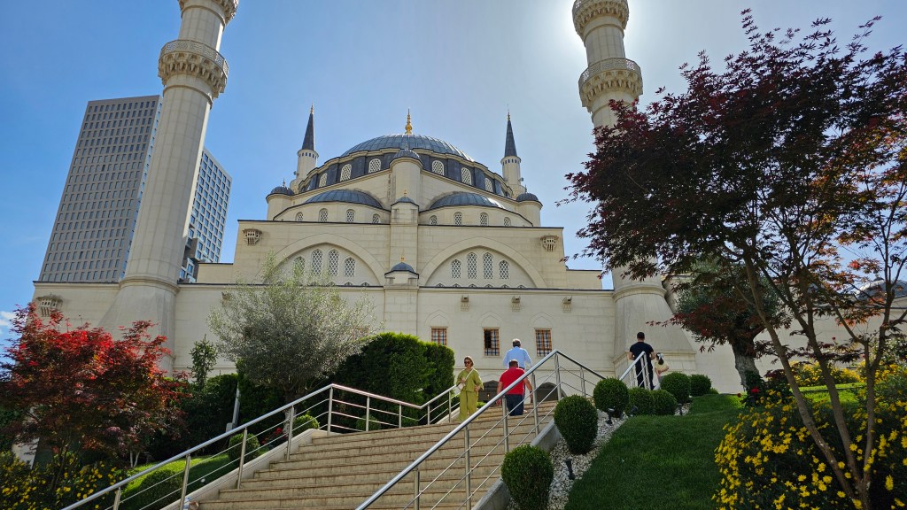 The inside of the Namazgah Mosque, also known as ‘The Great Mosque of Tirana’ is spectacular! This classical Ottoman style mosque was opened in October 2024 to provide a central location for Albanian Muslims to pray in. Until then, with the two existing cathedrals being Orthodox and Catholic, they had felt discriminated against as the smaller Et’hem Bej mosque can only accommodate 60 people.