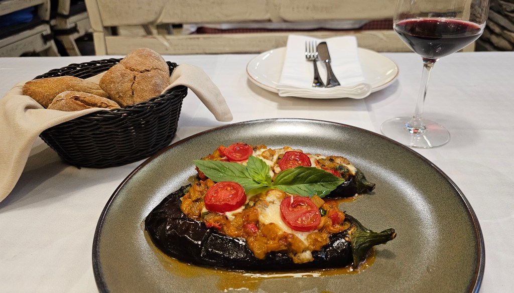 I wanted something traditional and chose ‘Imam Bajalldi’ which was a local home cooked dish of aubergines stuffed with peppers, garlic, fresh olive oil and some cheese melted on the top. It tasted amazing and was possibly the best aubergine dish ever.
