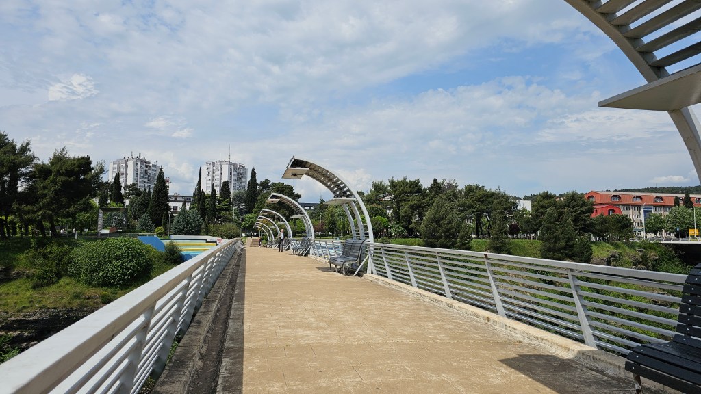 I soon came to the Moraca River where I crossed over the Moscow Bridge (a footbridge) as I headed towards Millenium Bridge from the other side of the river. These two bridges are a few minutes’ walk apart and here I found a bench in a shady park area to snack on the savoury pastries I had left over from breakfast that morning.
