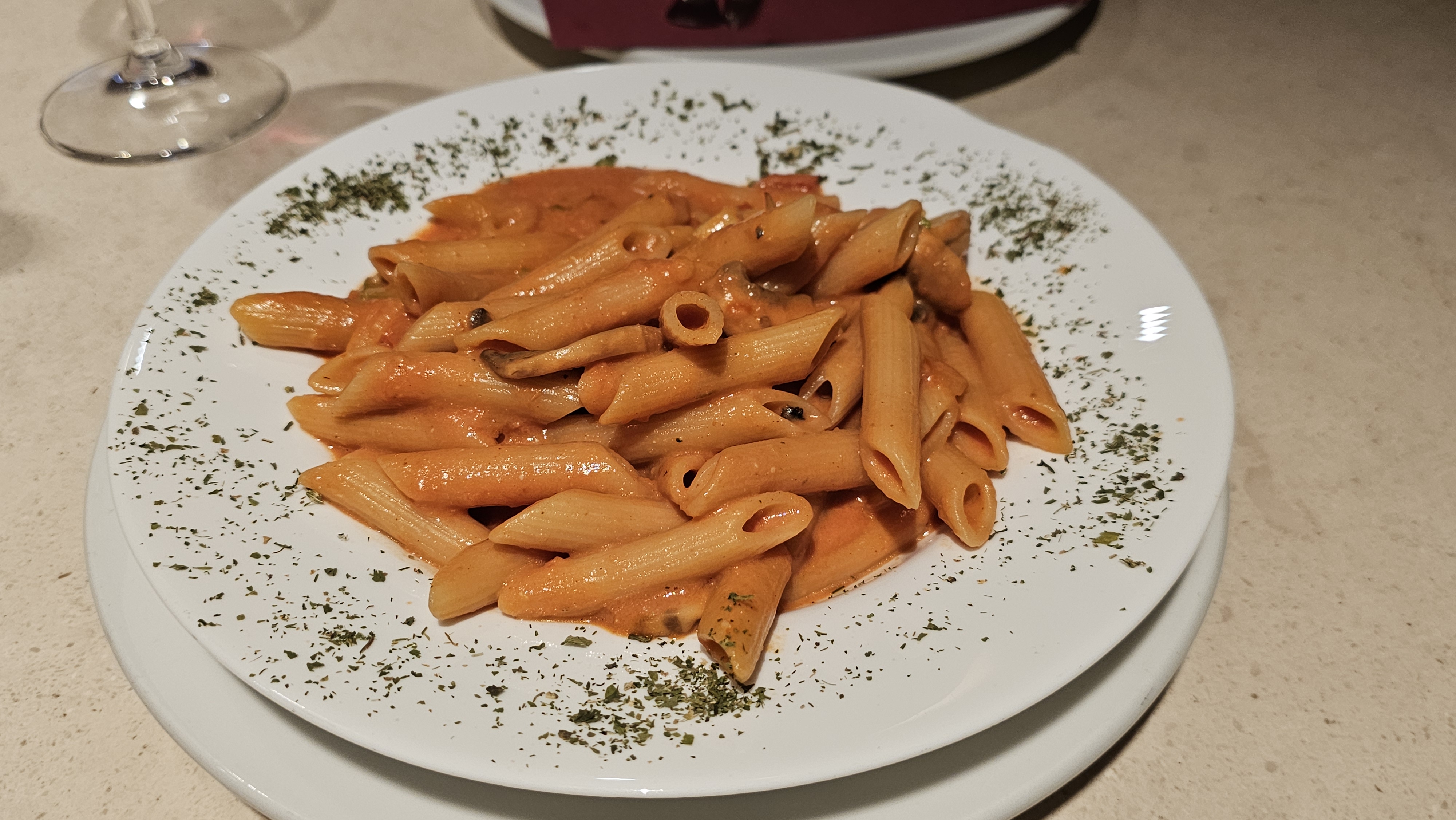I had a vegetarian pasta made with peppers, zucchini, mushrooms and tomato and this was delicious. At €9.50 this was a bit more expensive than Albania but still fairly low cost when compared with UK prices.